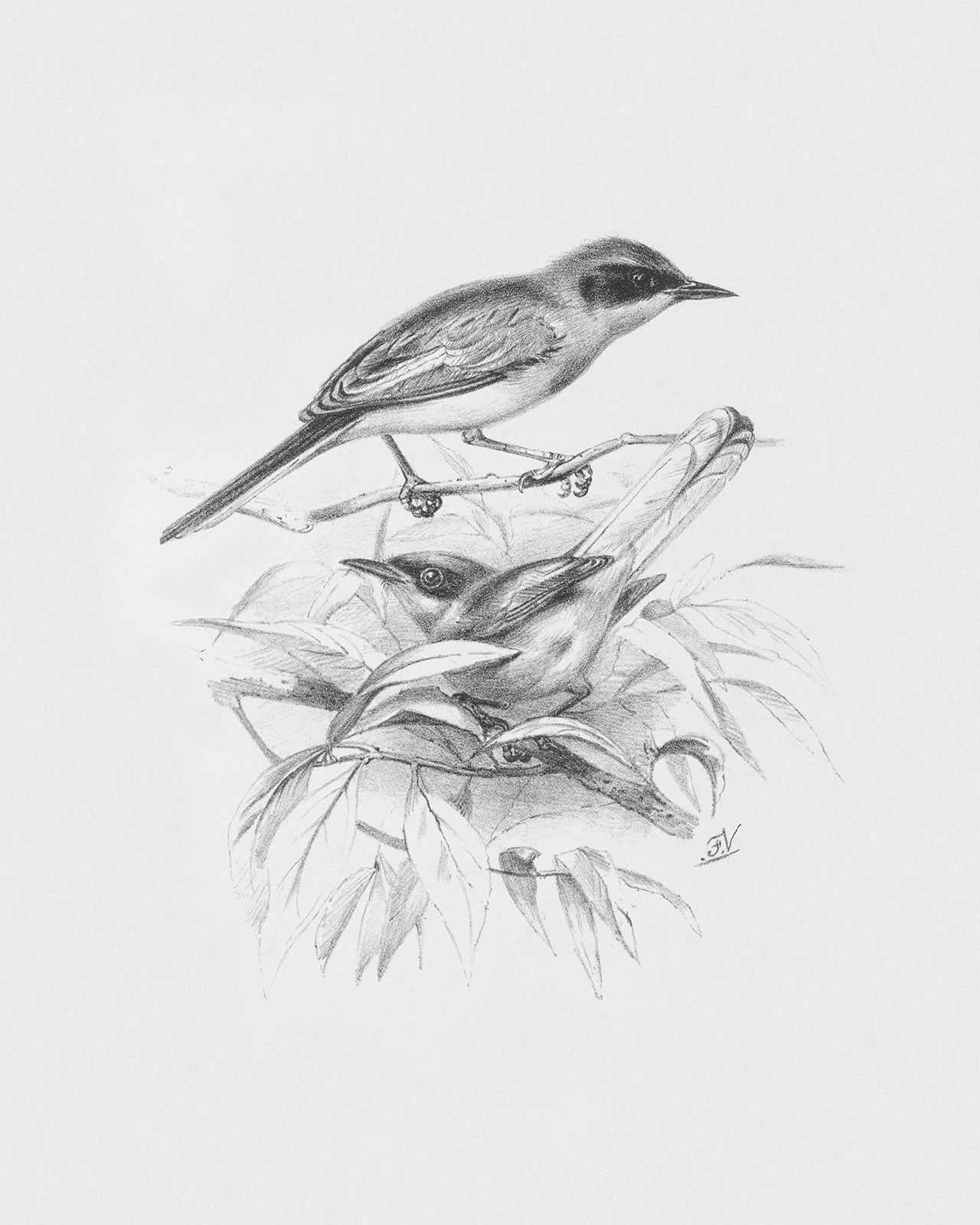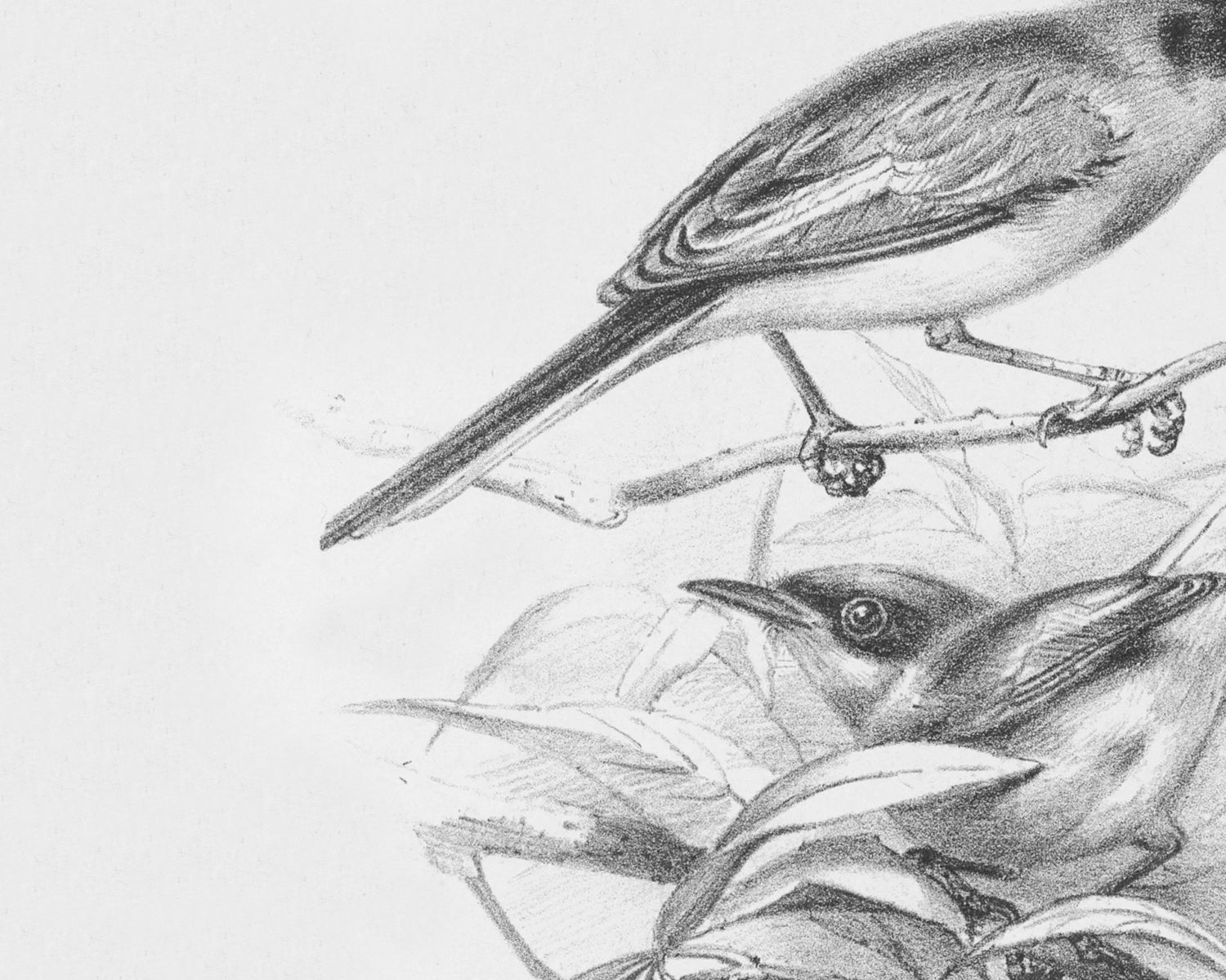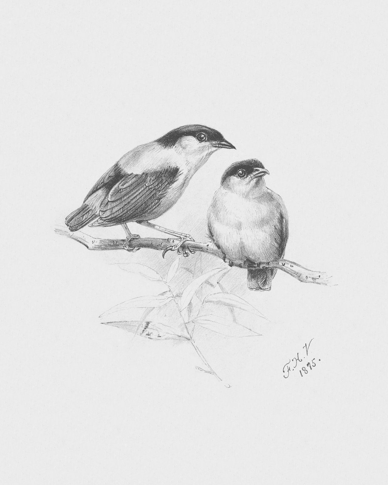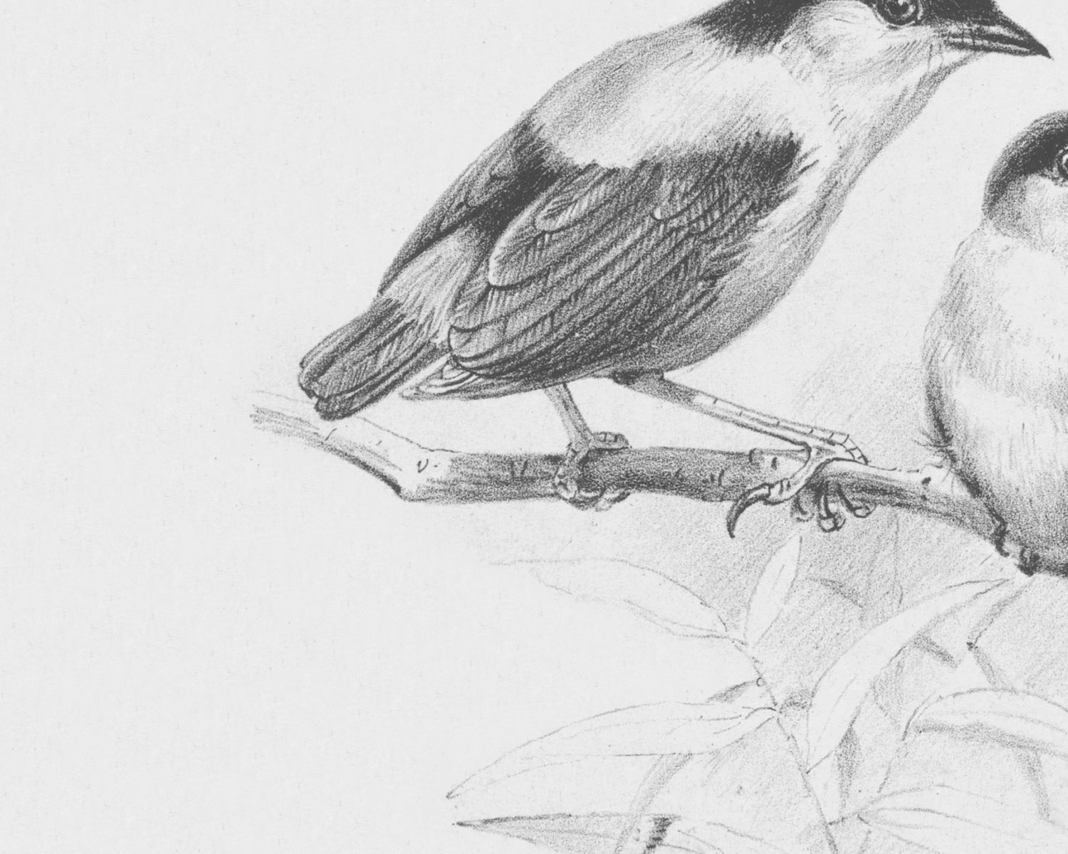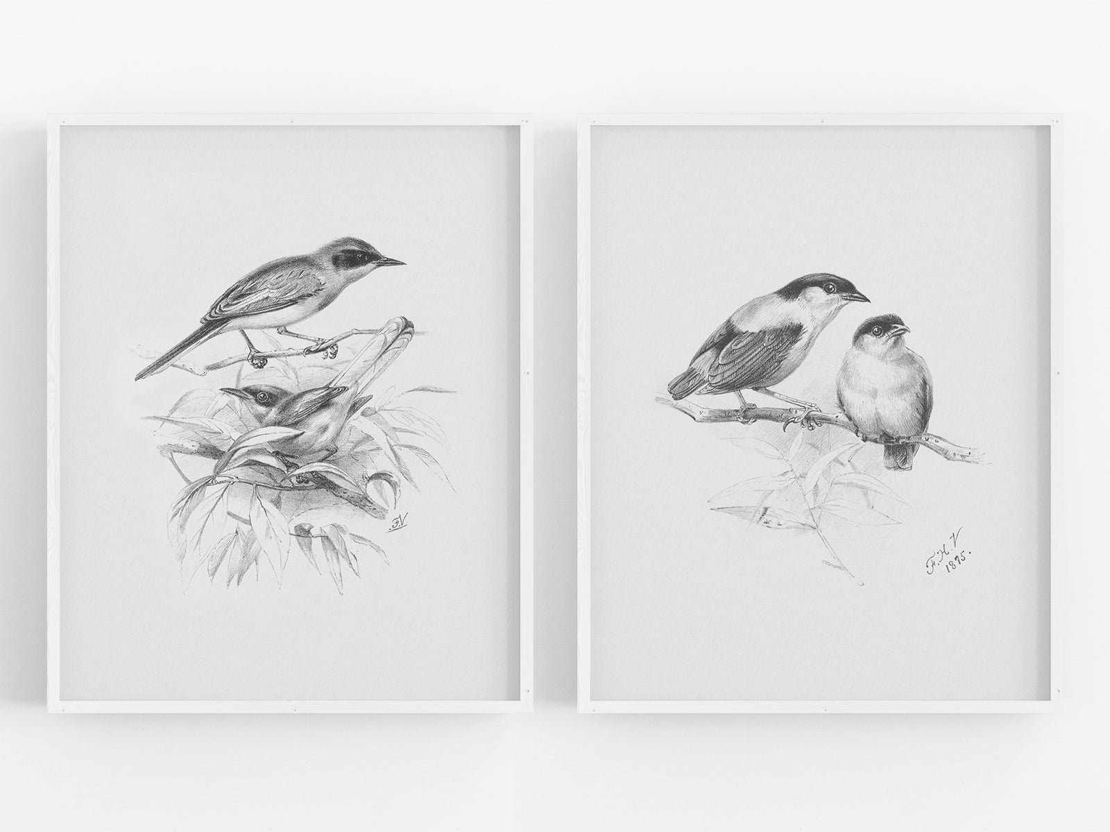 A set of two (2) vintage birds on branches sketch, reproduction art prints, c. 1875.
