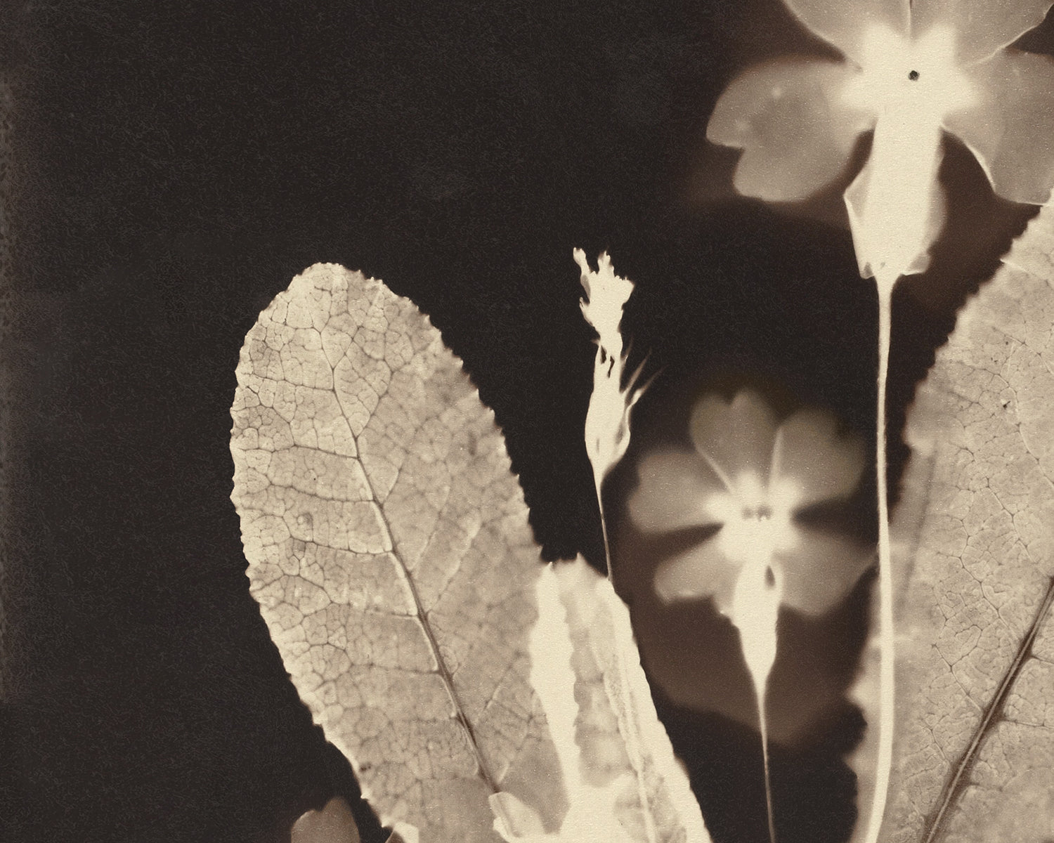 Among the earliest photographs known, this is a trace of a botanical specimen. The plant was placed directly on top of a sheet of photosensitized paper, blocking the rays of the sun from darkening those portions it covered and leaving a light impression of its form.