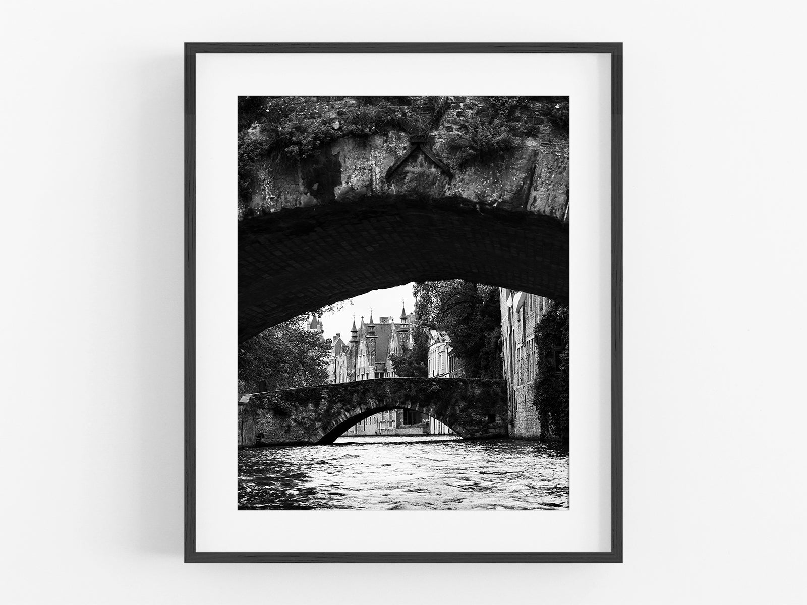 Bruges Belgium Bridge B&W photo gallery print. Photographed in Bruges at the Peerdenbrug Bridge with a view of the 14th century Meebrug Bridge, the oldest bridge in Bruges.