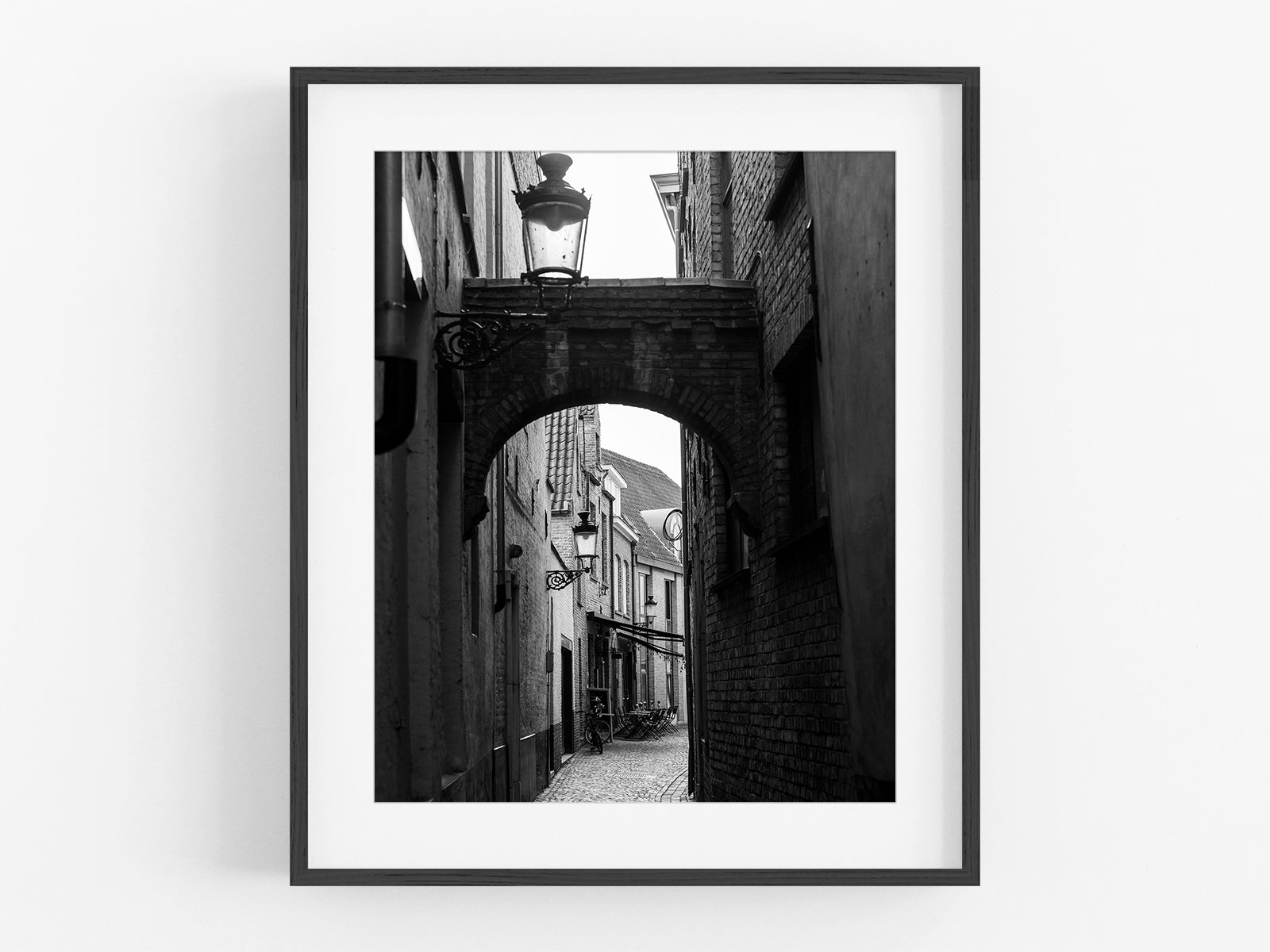 Bruges Belgium medieval street B&W photo gallery print. Photographed in Bruges at Kleine Sint-Amandsstraat.