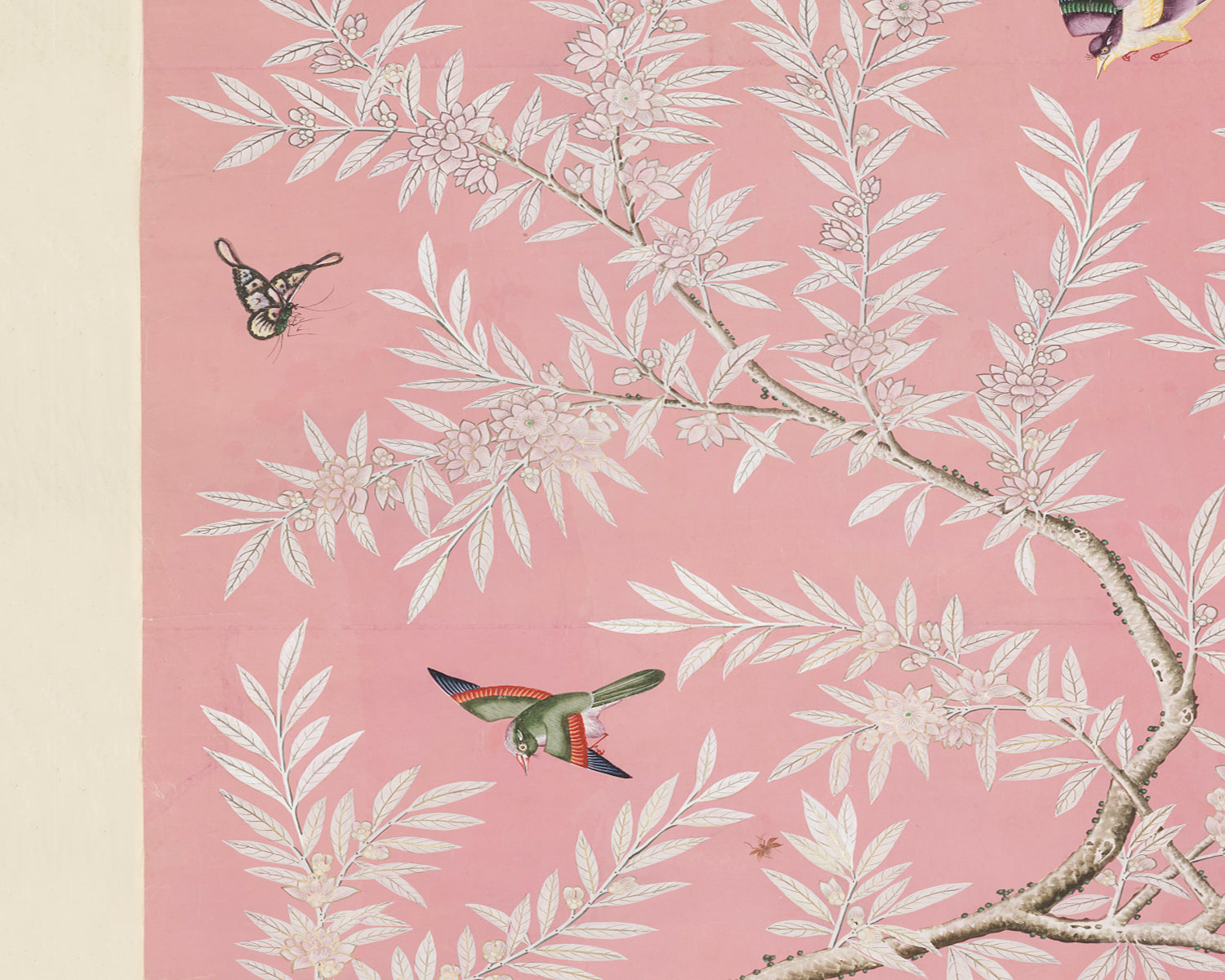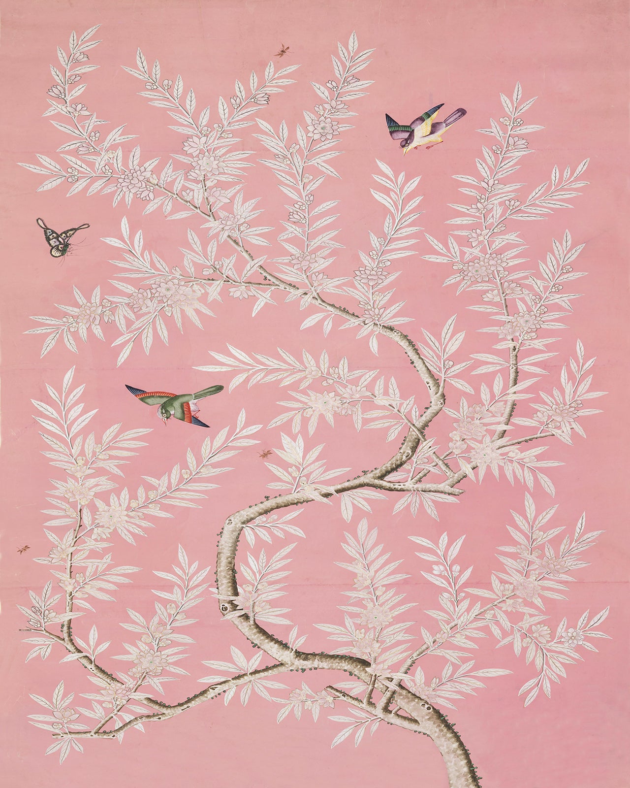 Vintage Chinese Chinoiserie bird and foliage art print: pink colorway. C. 1800-1830. Adapted from a Chinese painted panel.