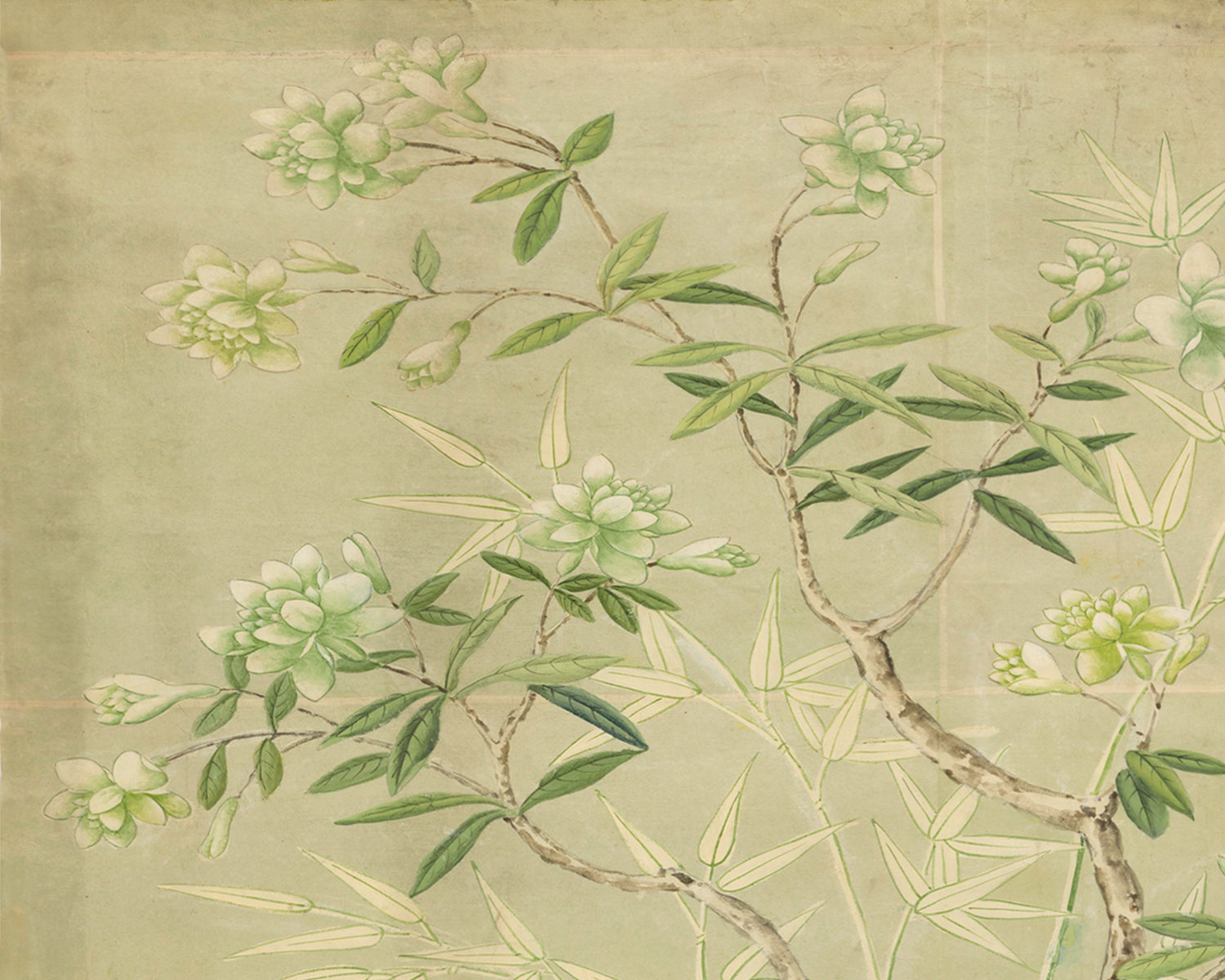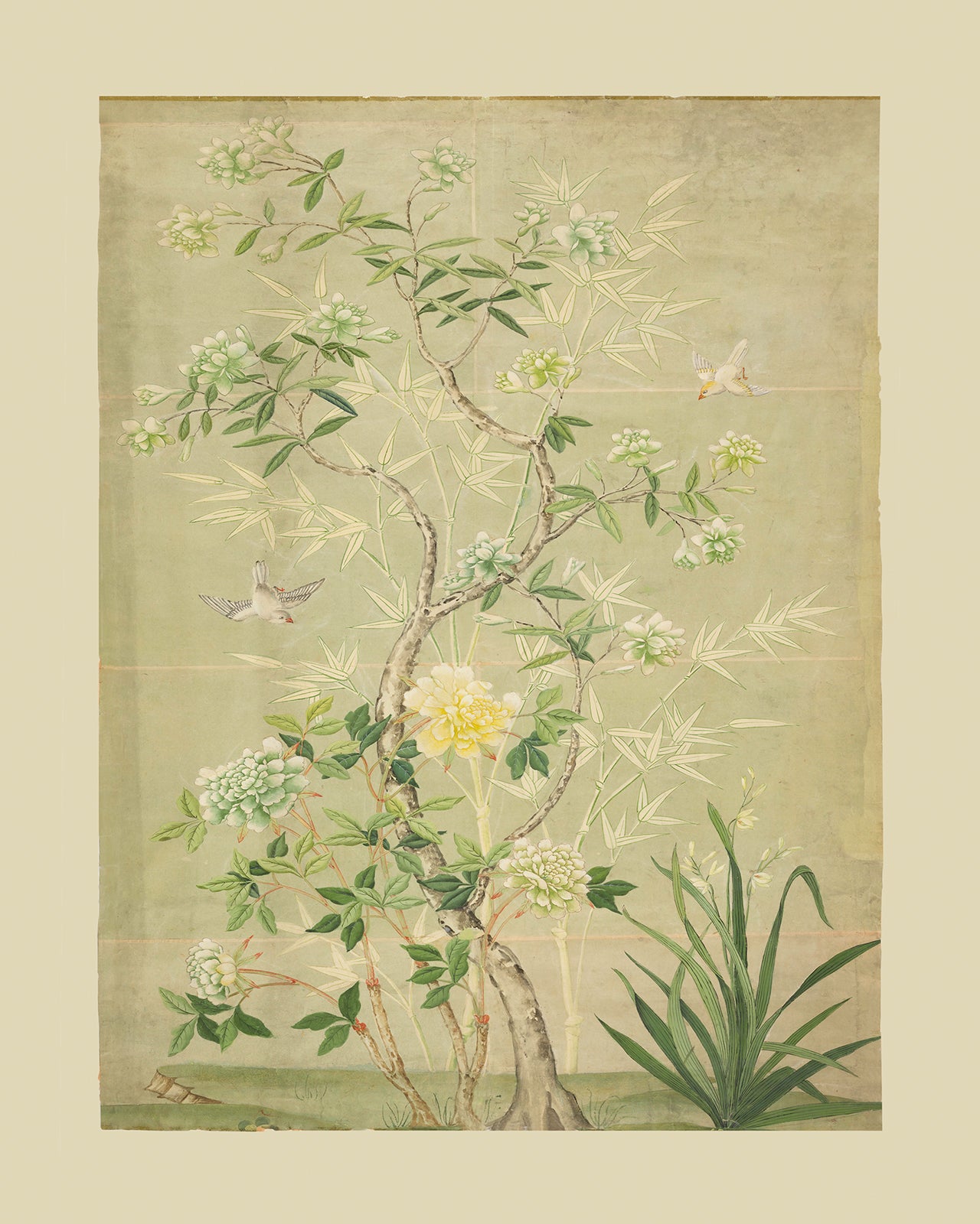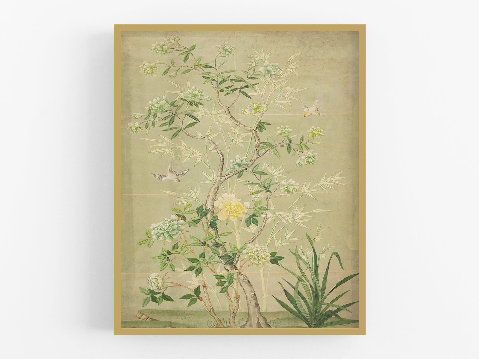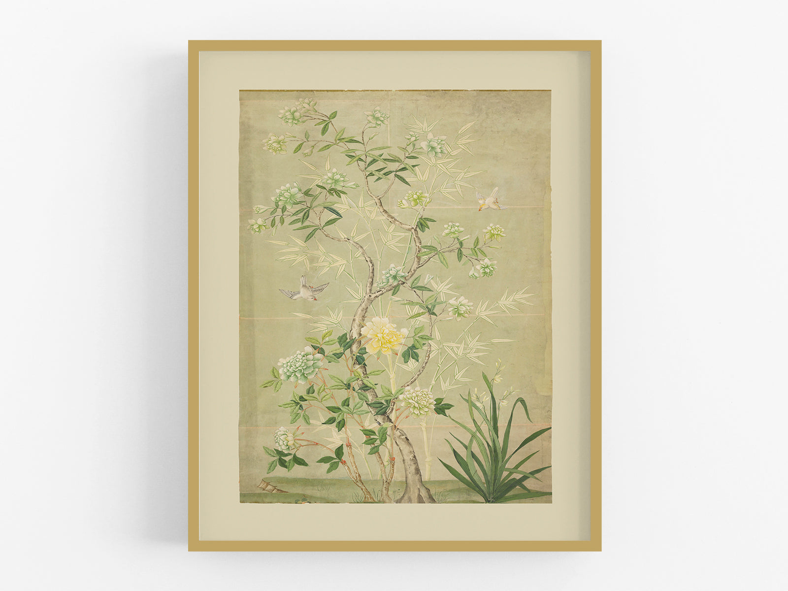 Chinoiserie scenic vintage reproduction art print, c. 1775-1799. Adapted from a Chinese painted paper panel.