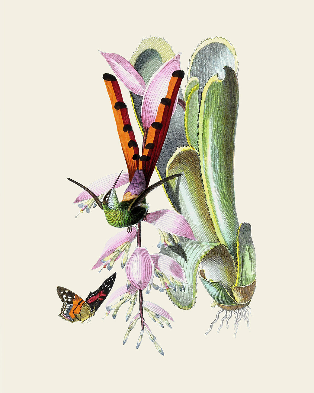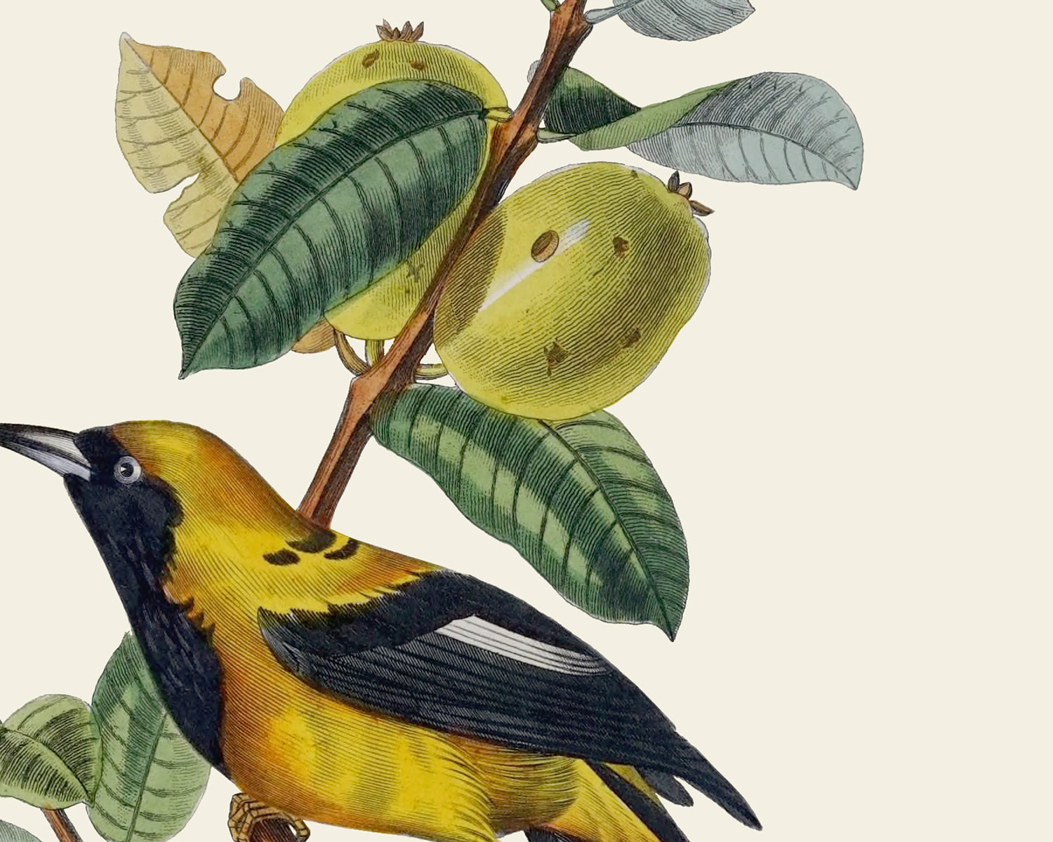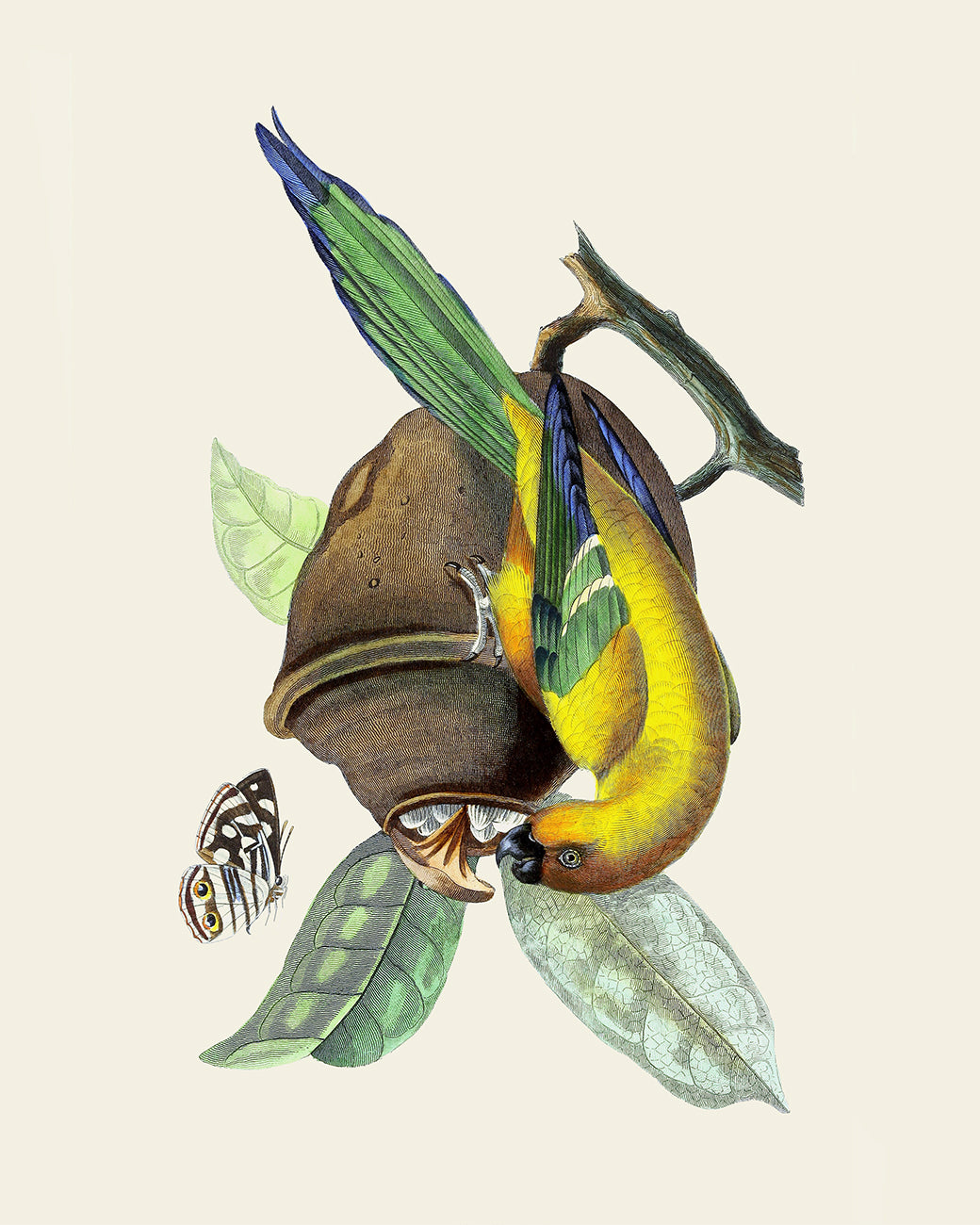 Colorful tropical bird vintage reproduction art prints - set of six (6) in green and yellow tones, c. 1842 - 1843.
