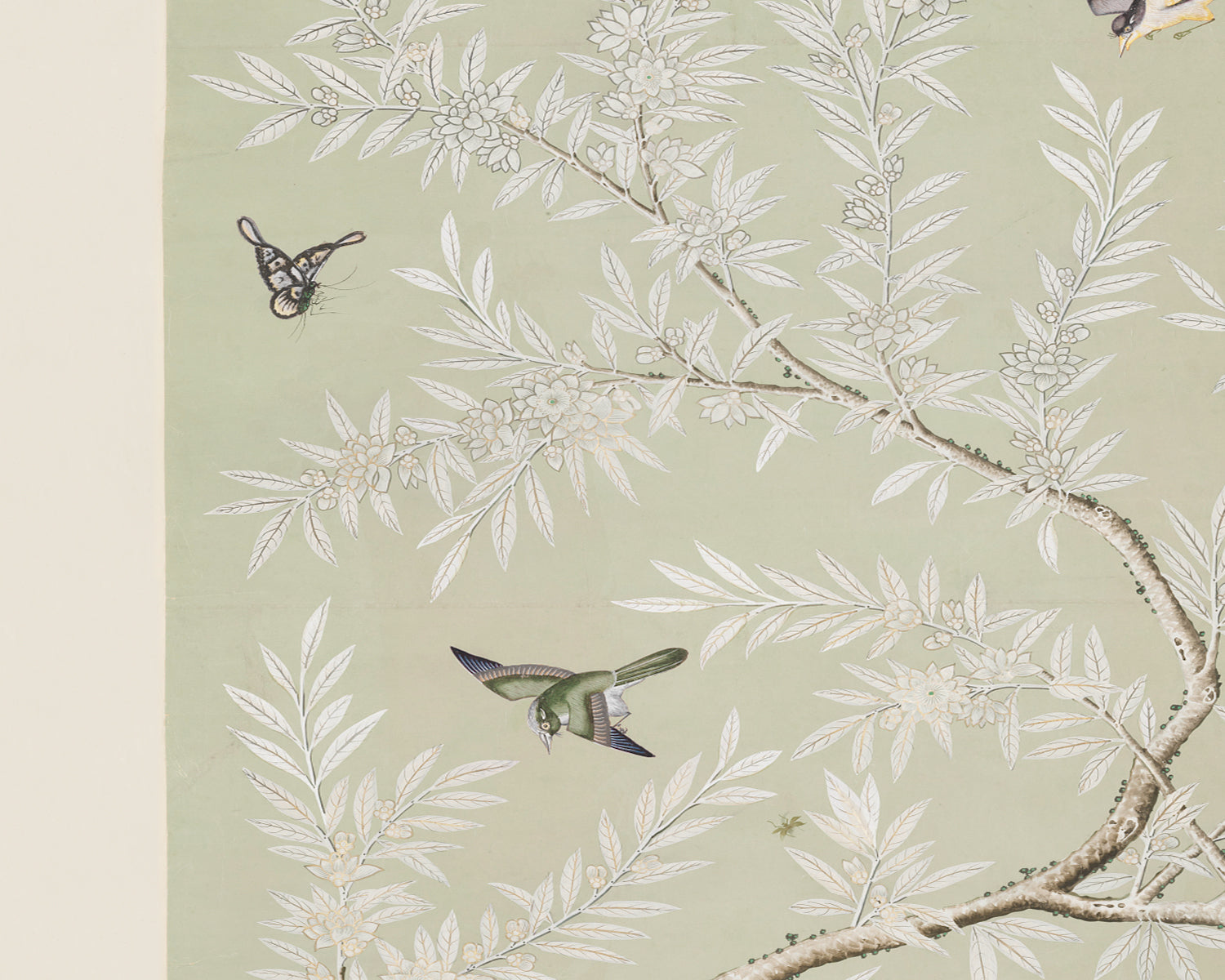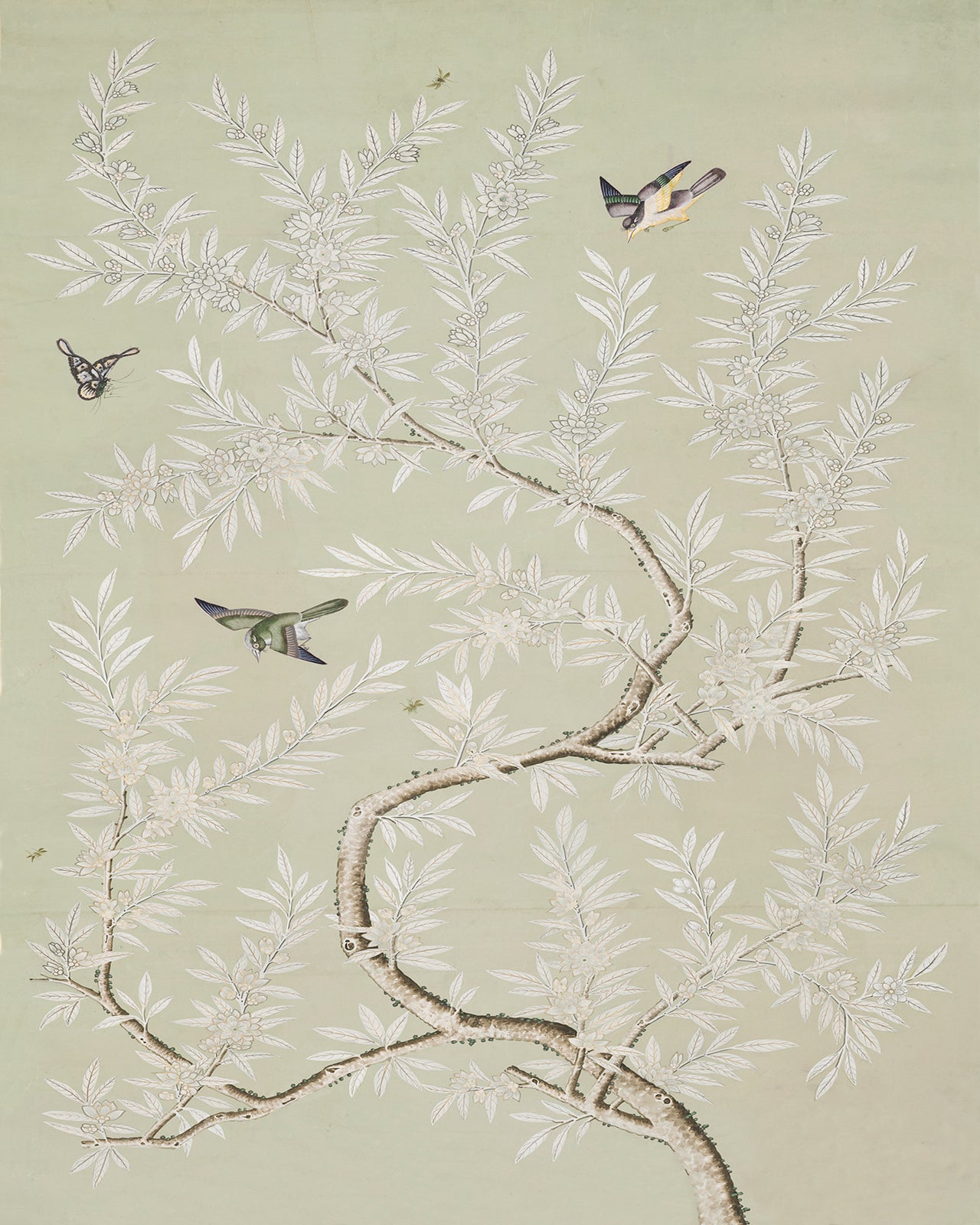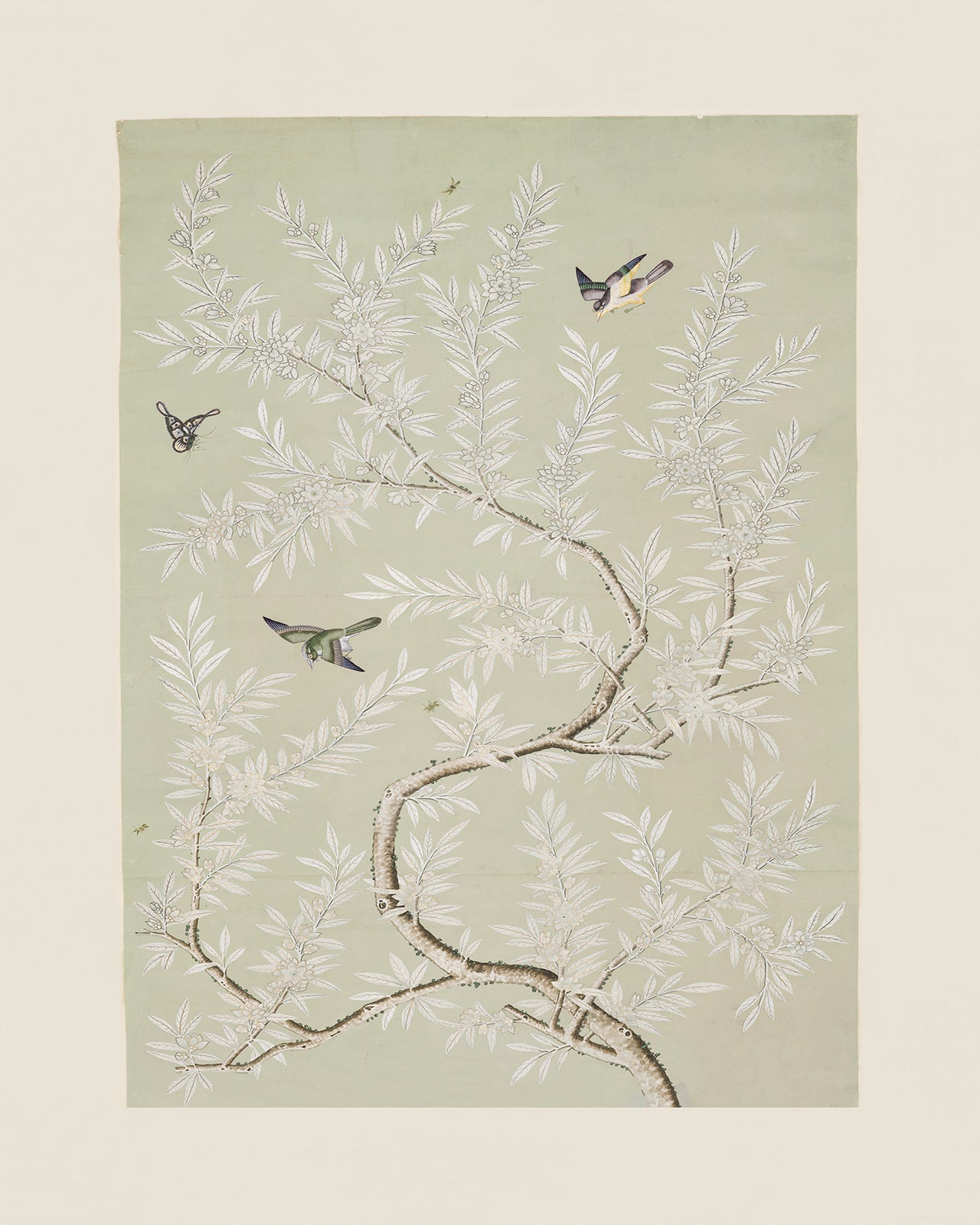 Vintage Chinese Chinoiserie bird and foliage art print: mint colorway. C. 1800-1830. Adapted from a Chinese painted panel. Available with and without border.