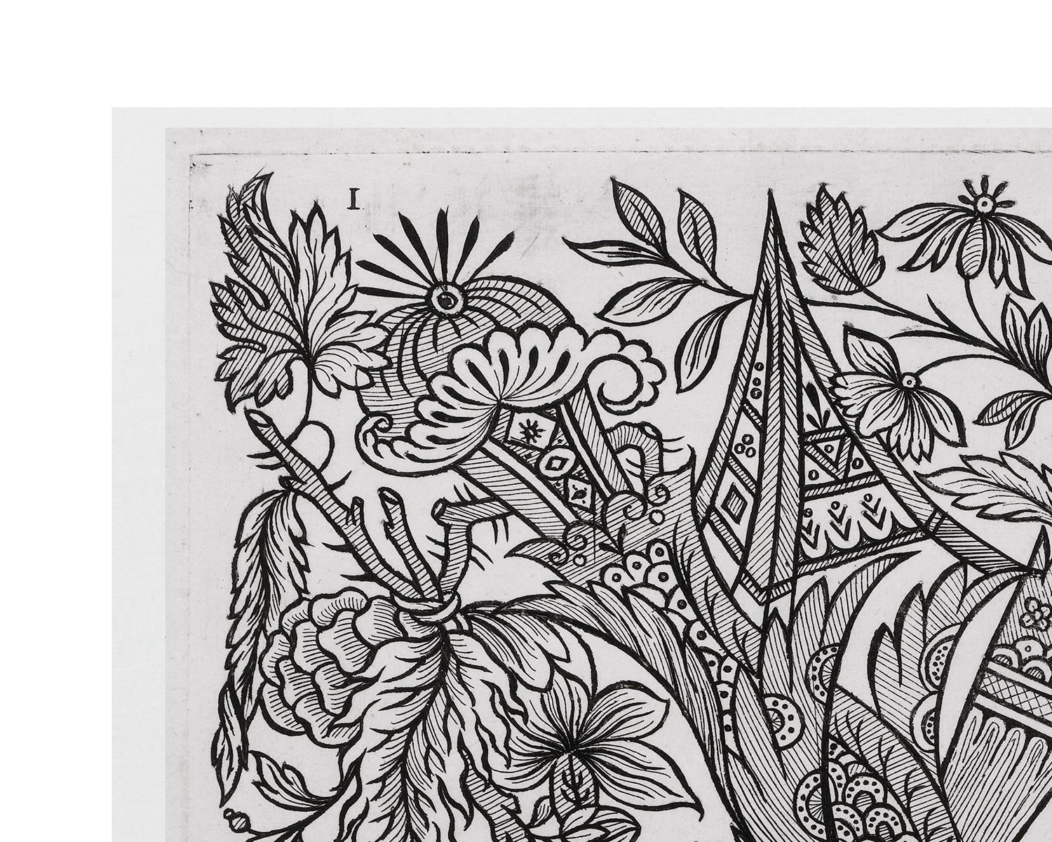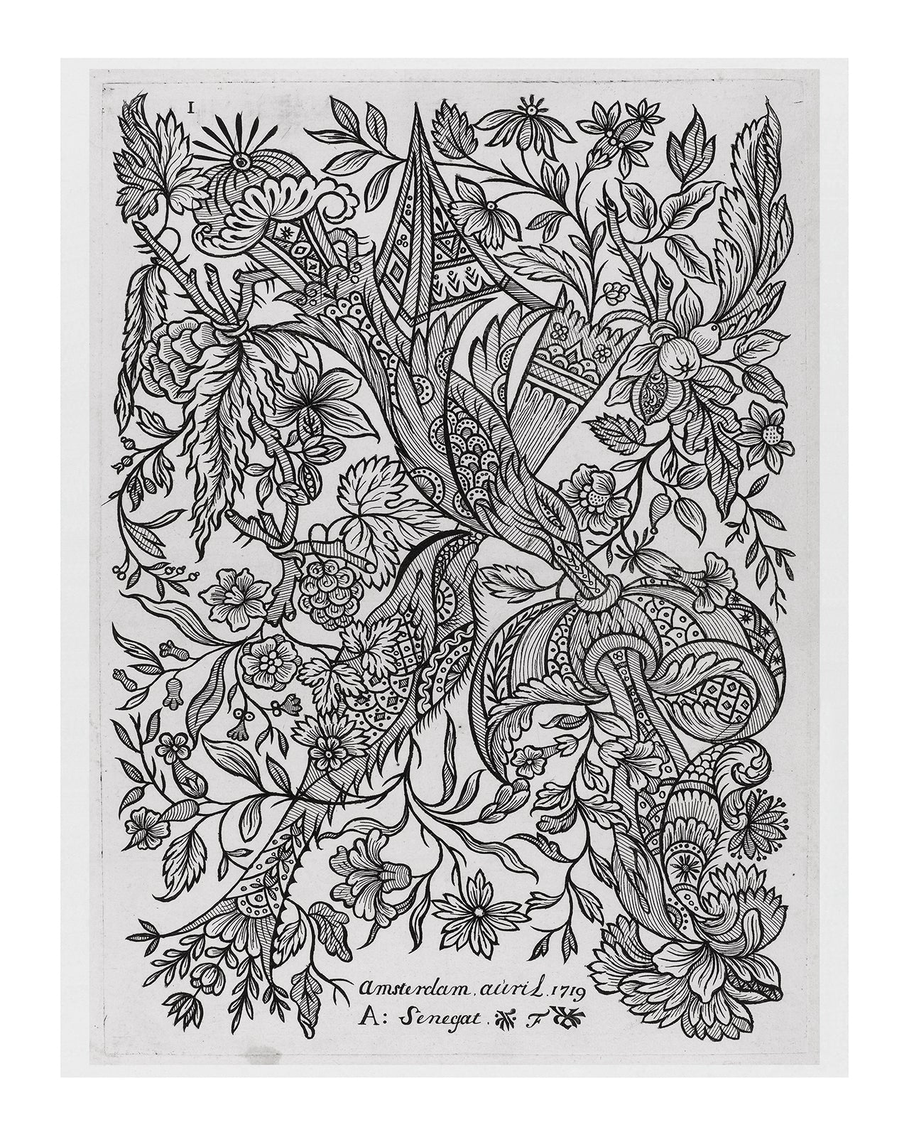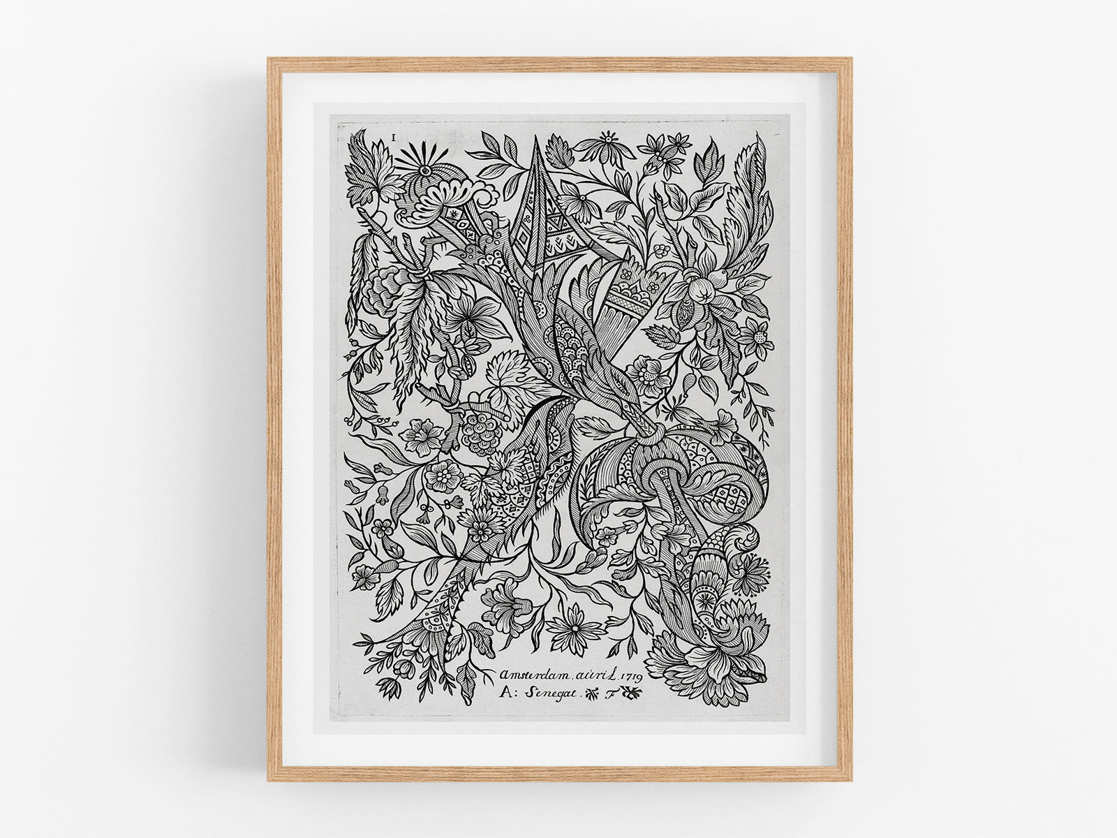 Dutch flower design etching #75, vintage reproduction art print, c. 1719.