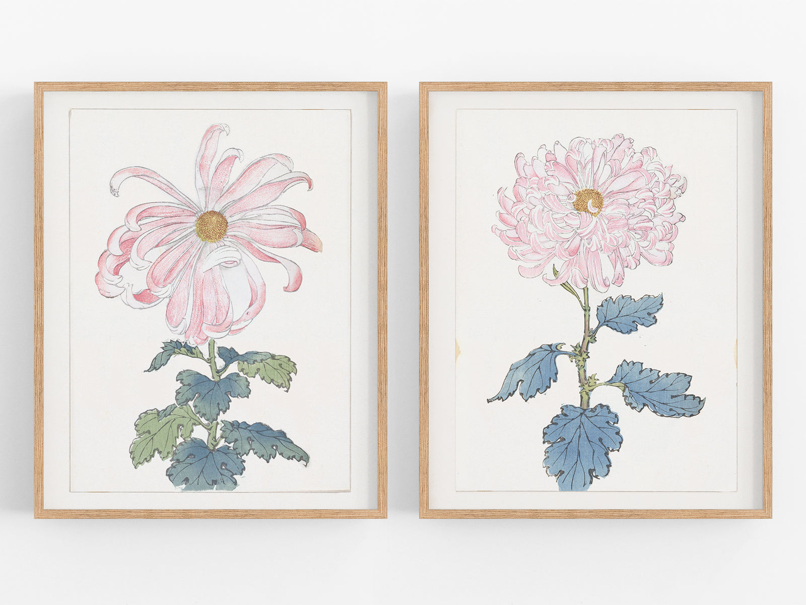 Japanese Pink Chrysanthemum Flower Art Prints, #1 & #6 - Set of Two