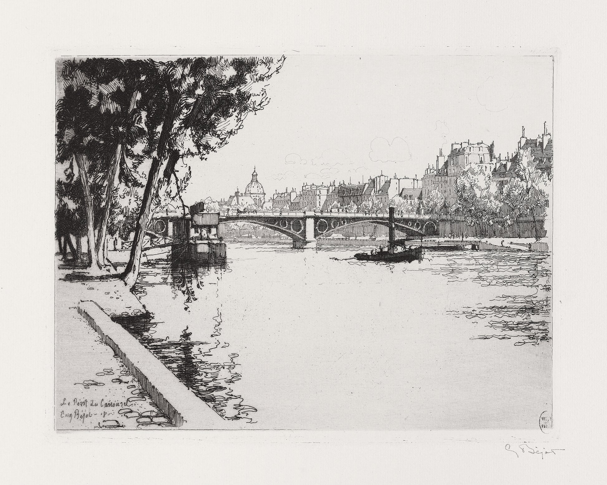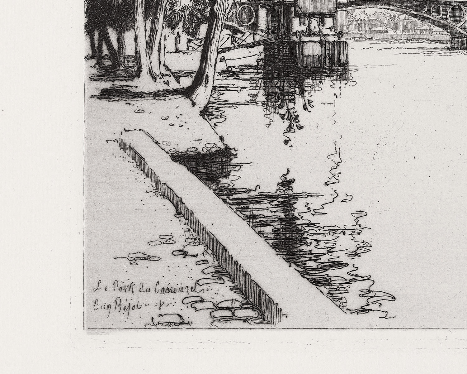 The Carousel Bridge Paris, etching reproduction art print, c. 1920.
