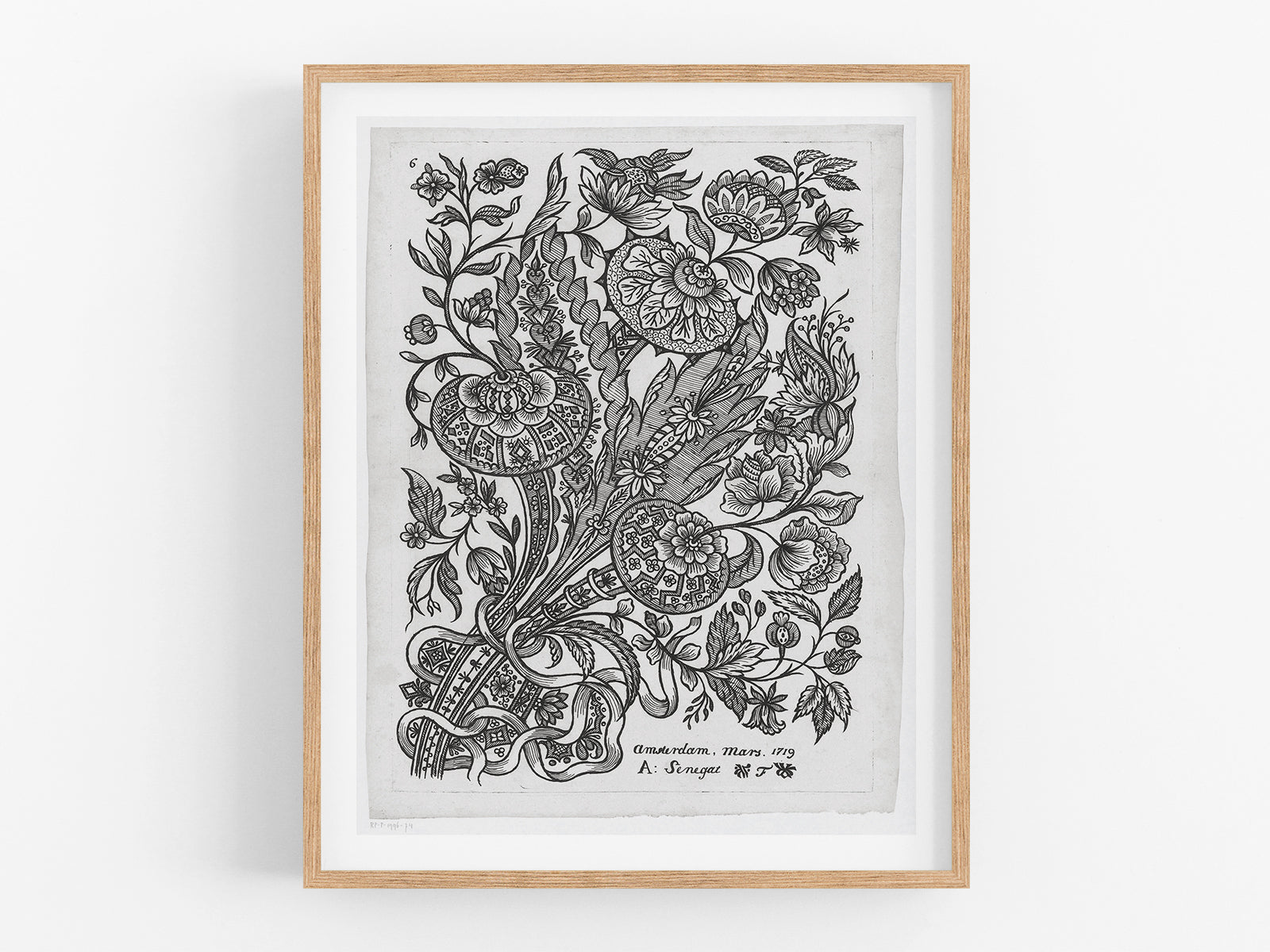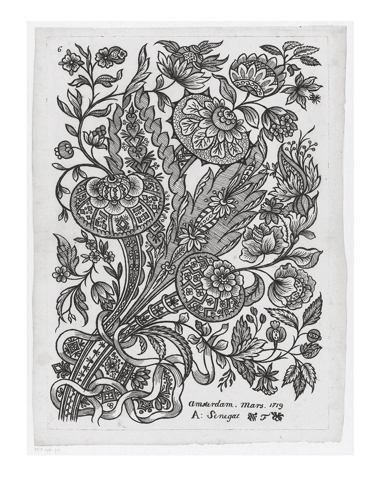 Dutch flower design etching #74, vintage reproduction art print, c. 1719.