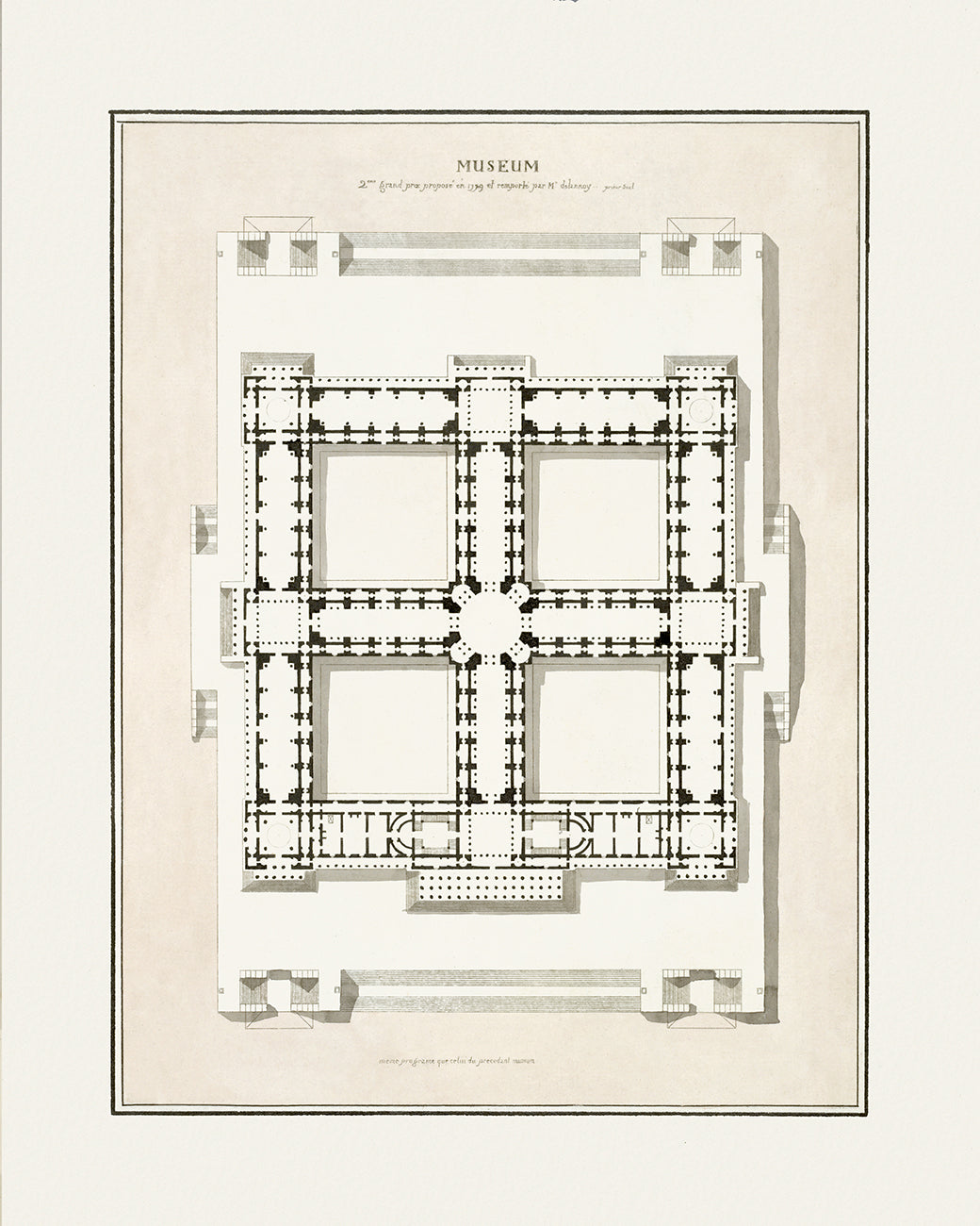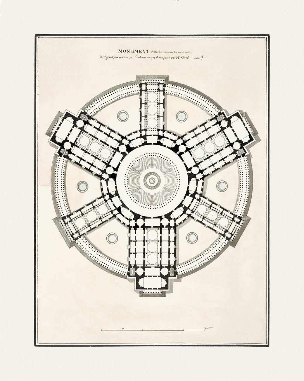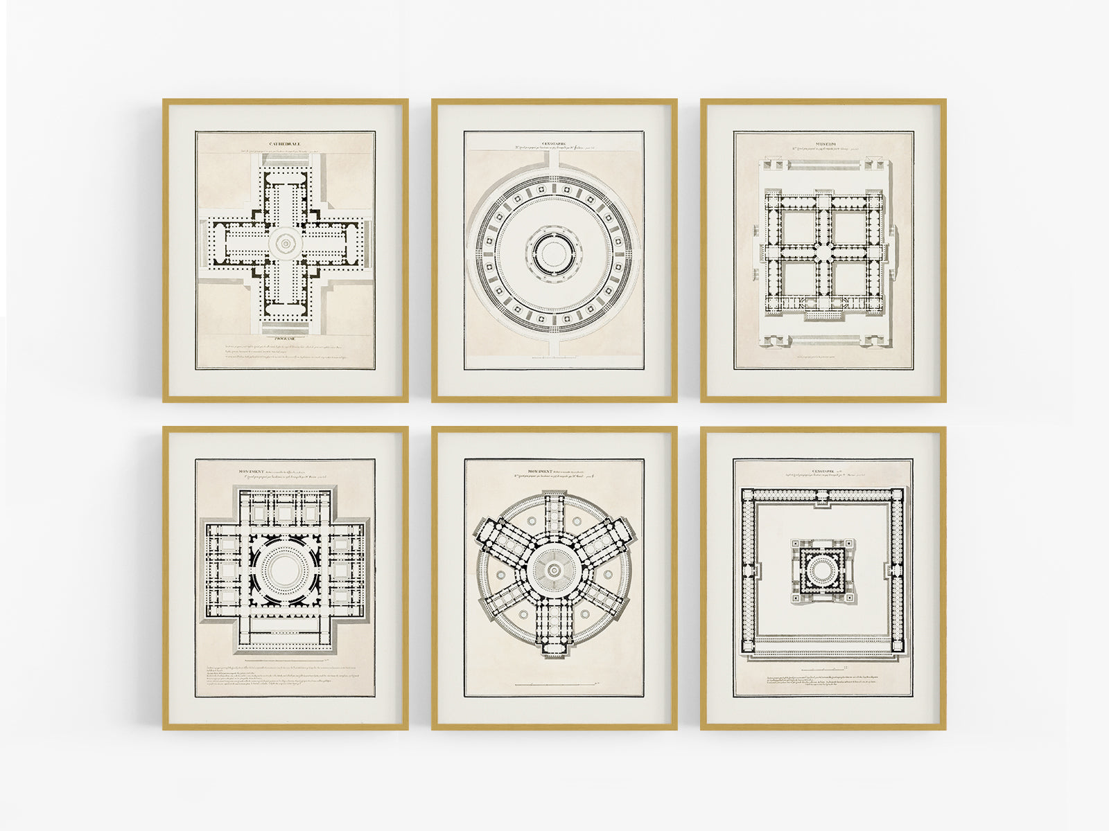French architectural plan drawings, reproduction art prints, c. 1805.