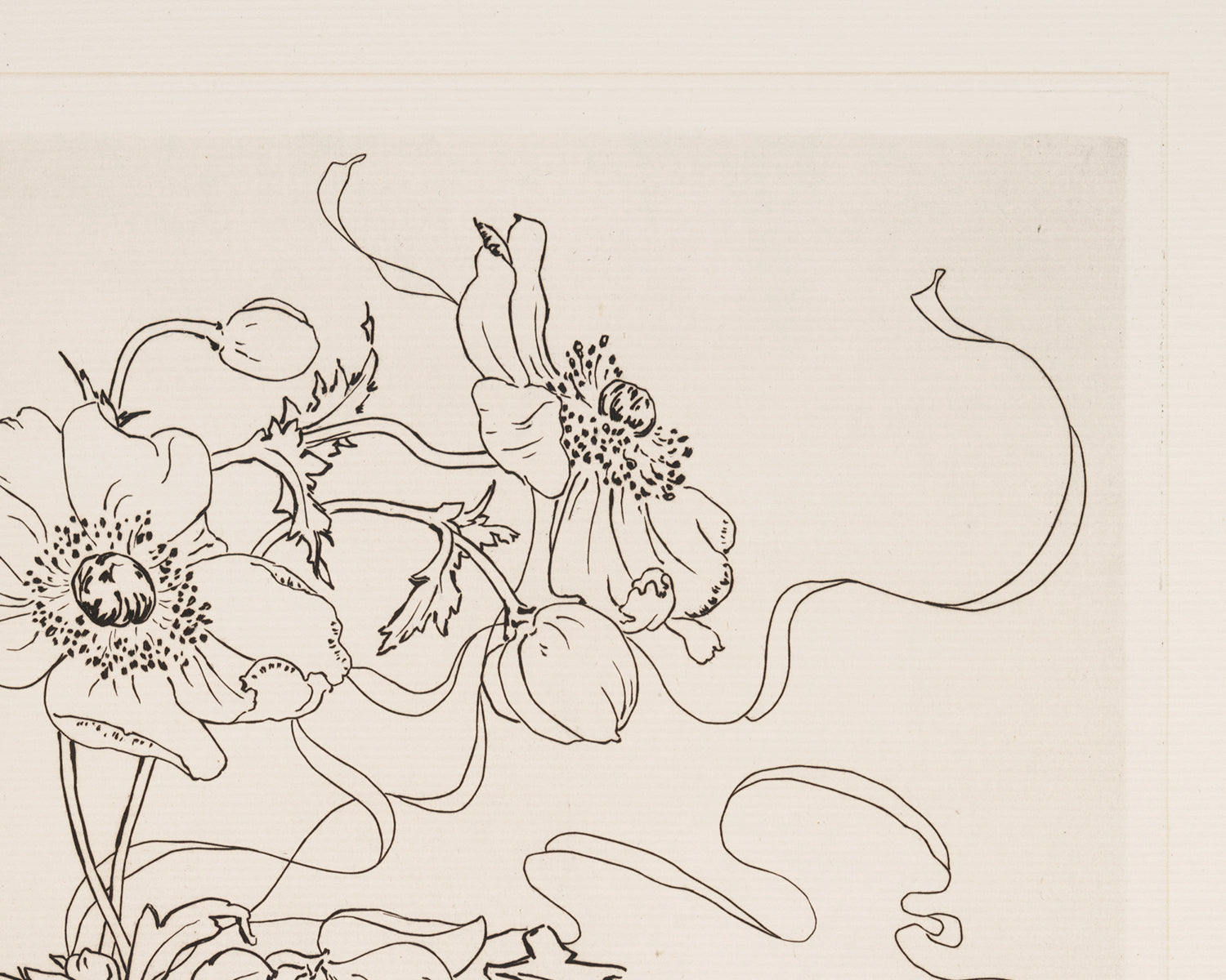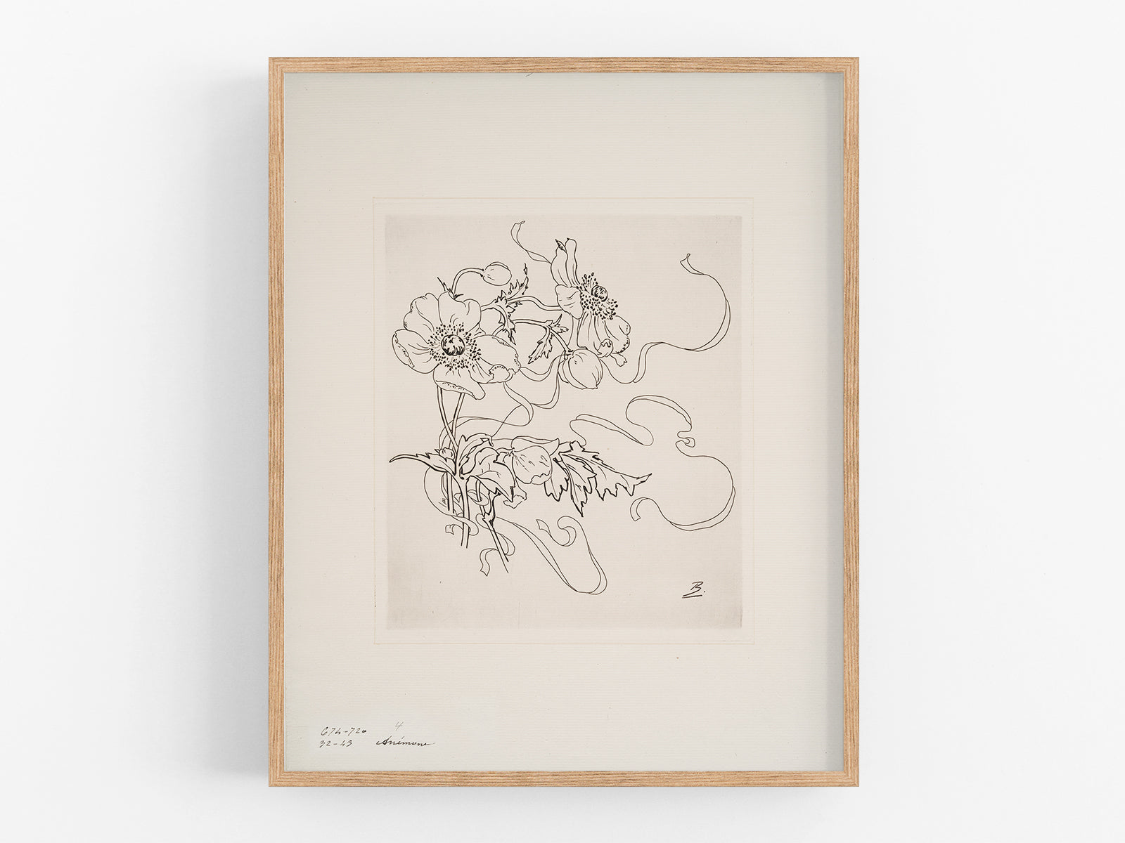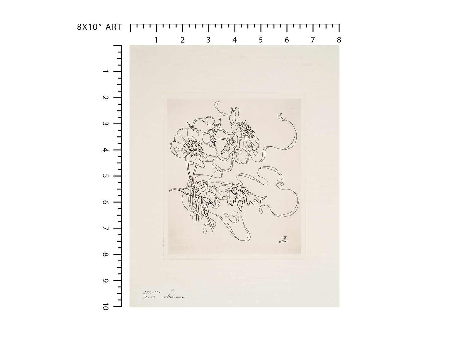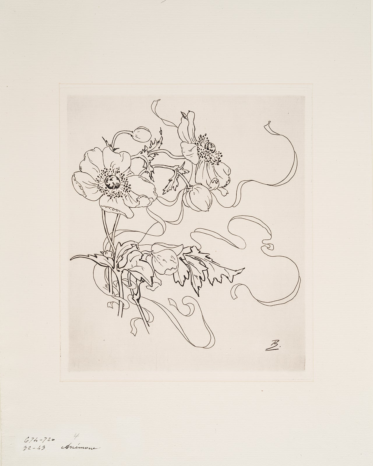 French porcelain flower sketch art print: Anemone. This art features a wide border with the flower name written in French on the bottom left. Available without border on request.