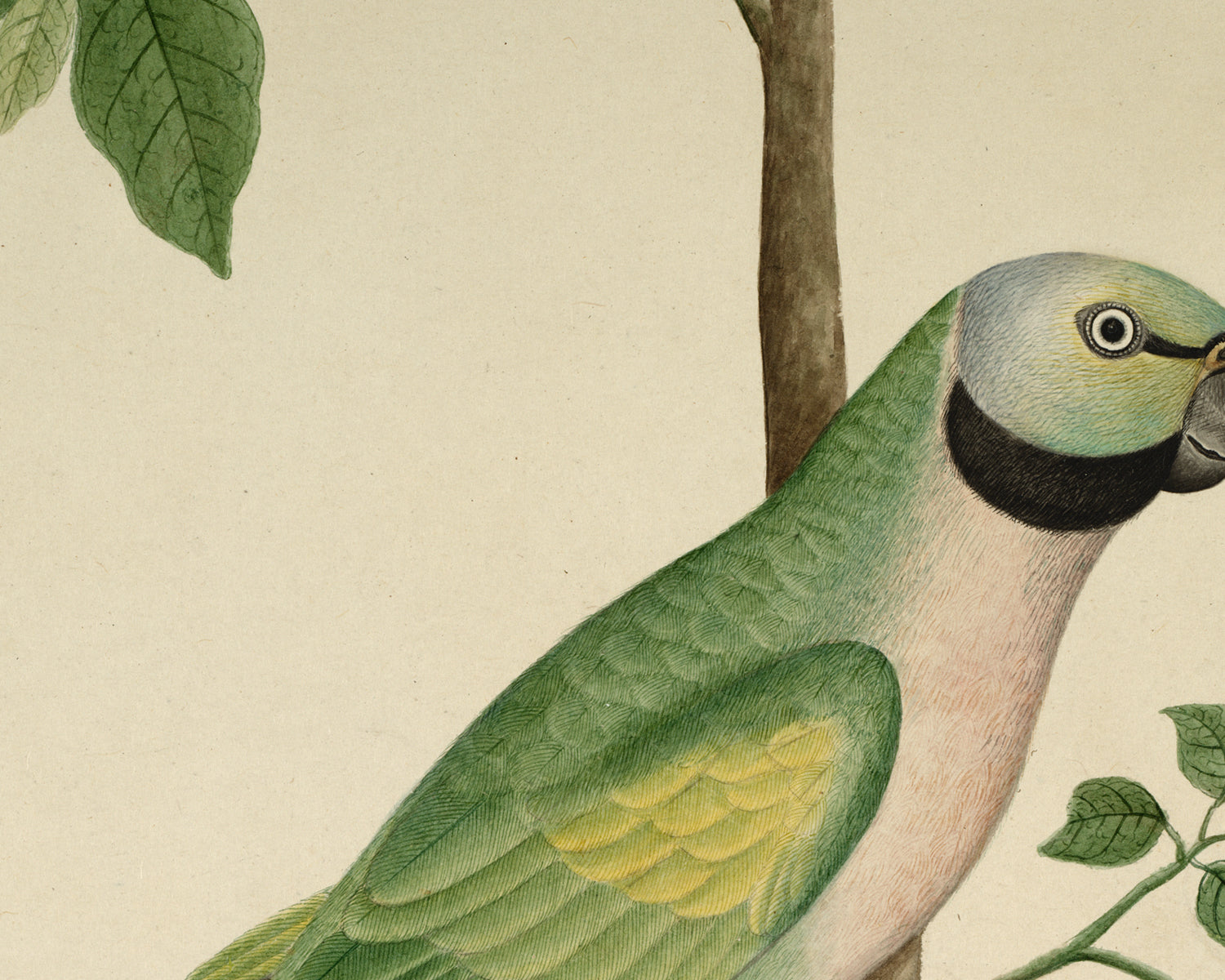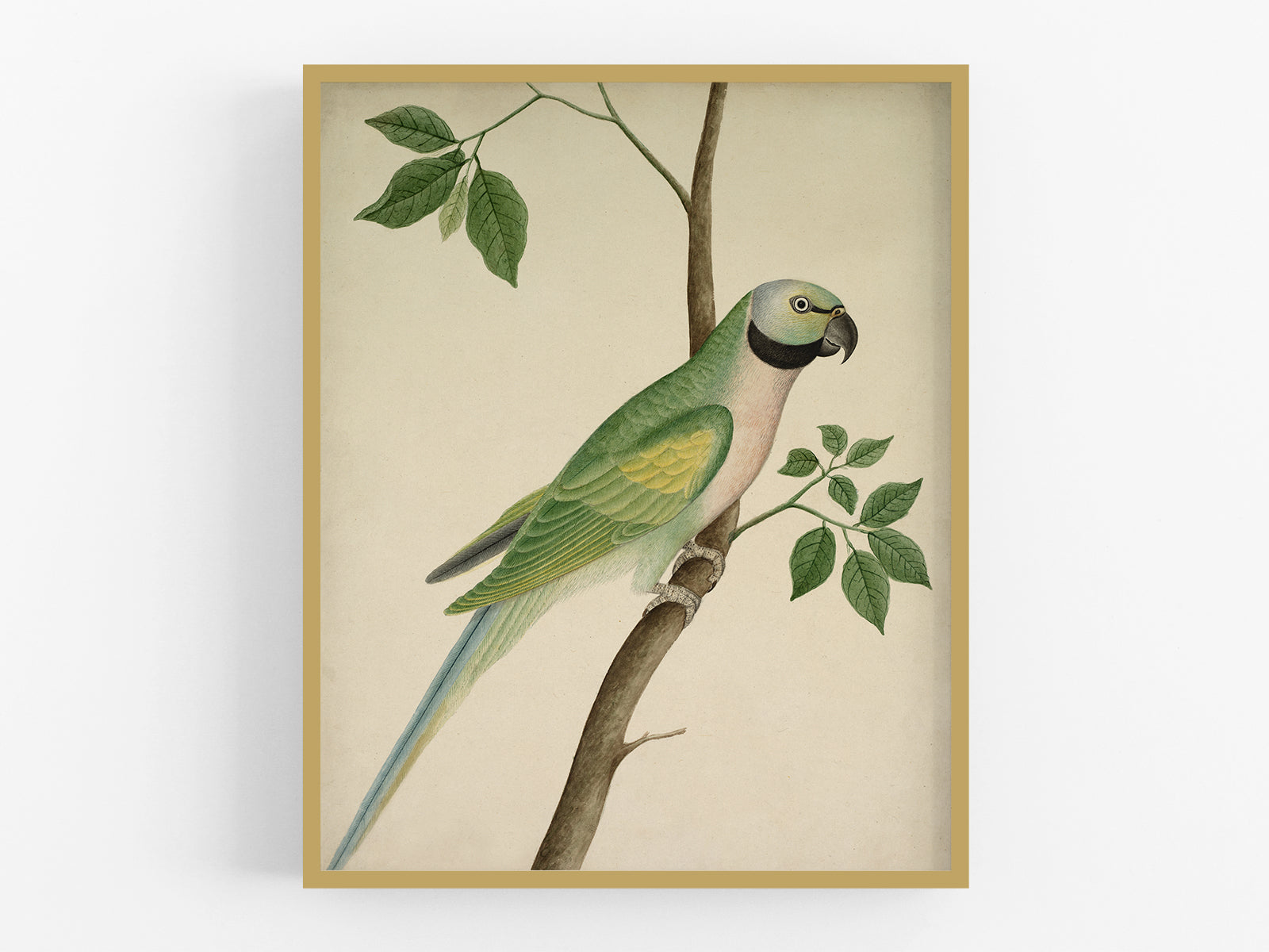 Green parrot vintage reproduction art print, c. 1820. An East India Company art item.