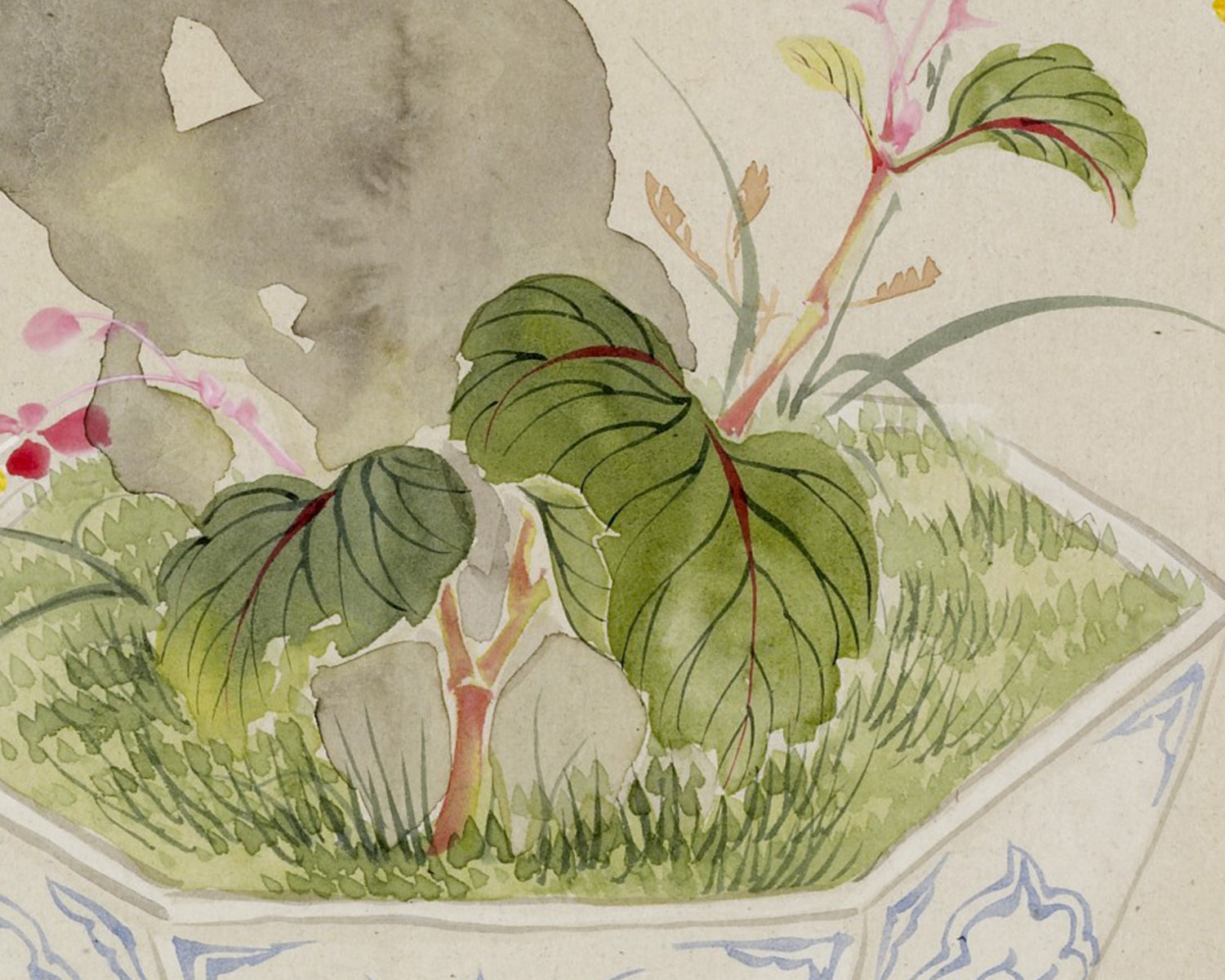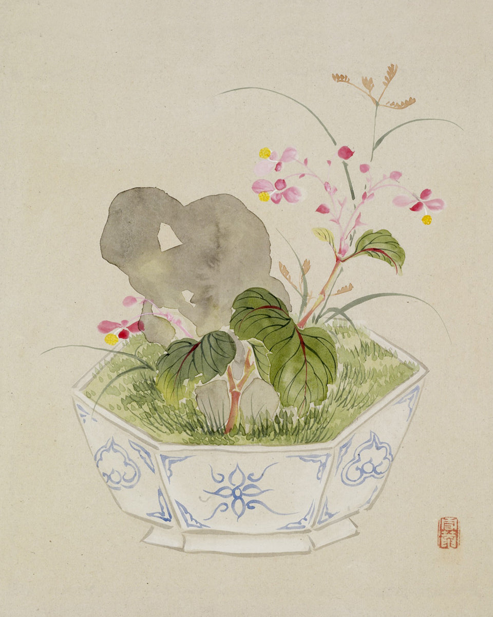 Set of three (3) Japanese lotus flowers in pots, reproduction art prints, c.1876.