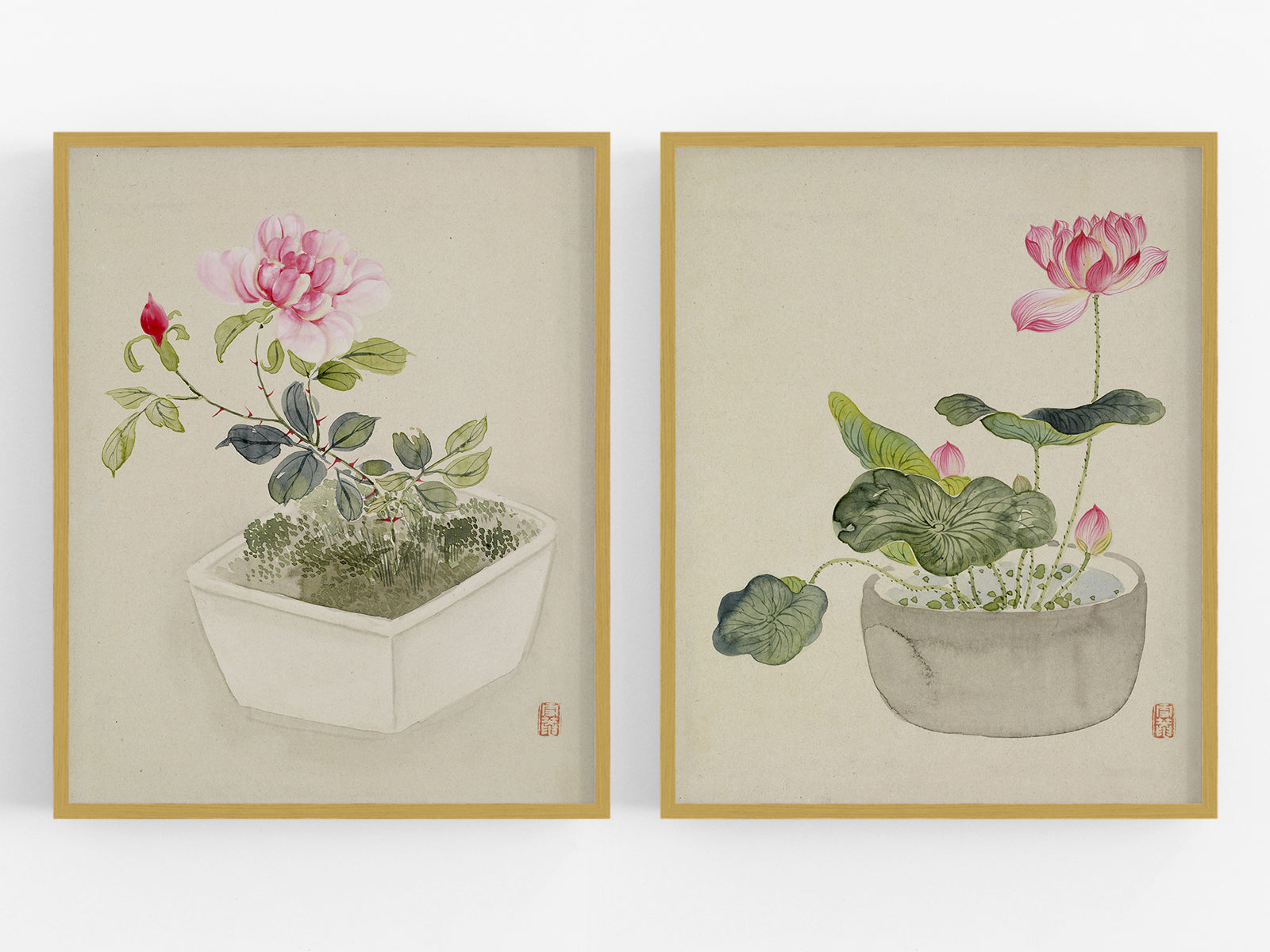 Japanese Lotus Flowers in Pots Art Prints - Set of Two