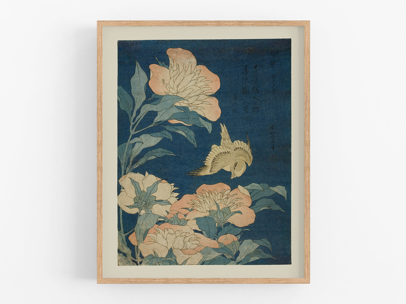 Japanese Woodblock Bird Art Print: Canary and Peony