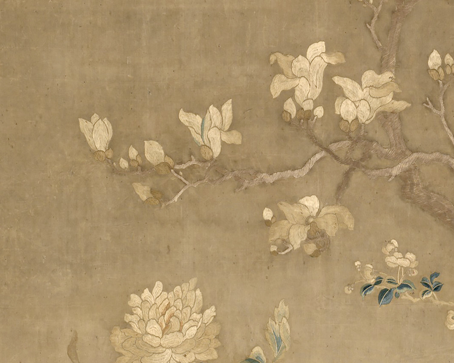 Vintage magnolia tree chinoiserie reproduction art print: magnolia, crabapple and peony, c. late 17th century. Adapted from a Chinese embroidery.