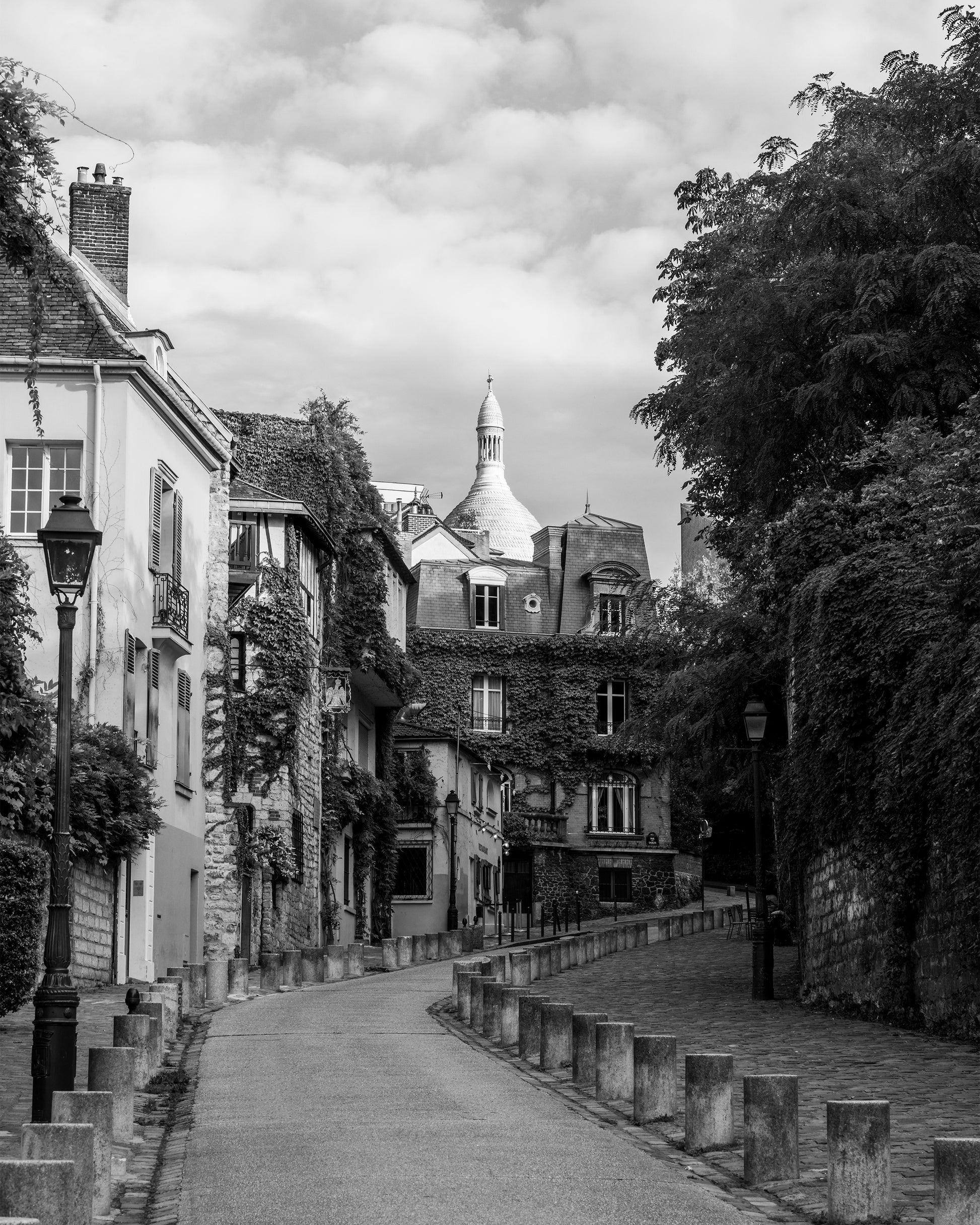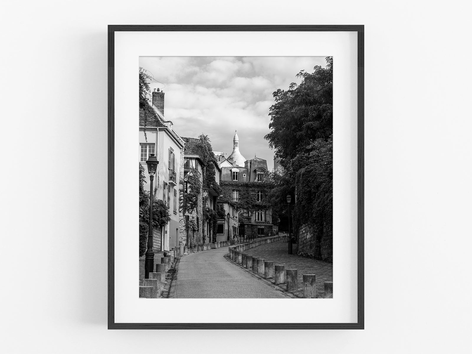Montmartre Museum Paris, B&W photo gallery print: Rue de l’Abreuvoir with a view of the Basilica of the Sacré-Coeur.