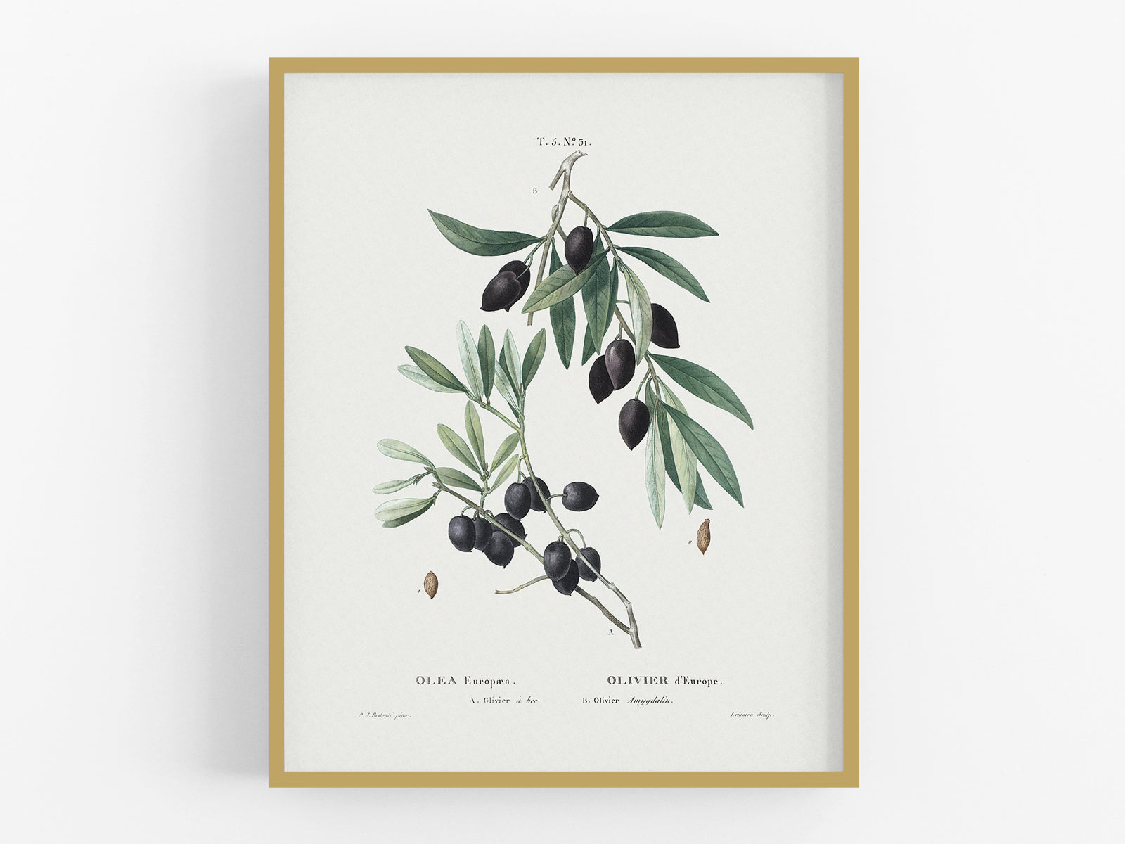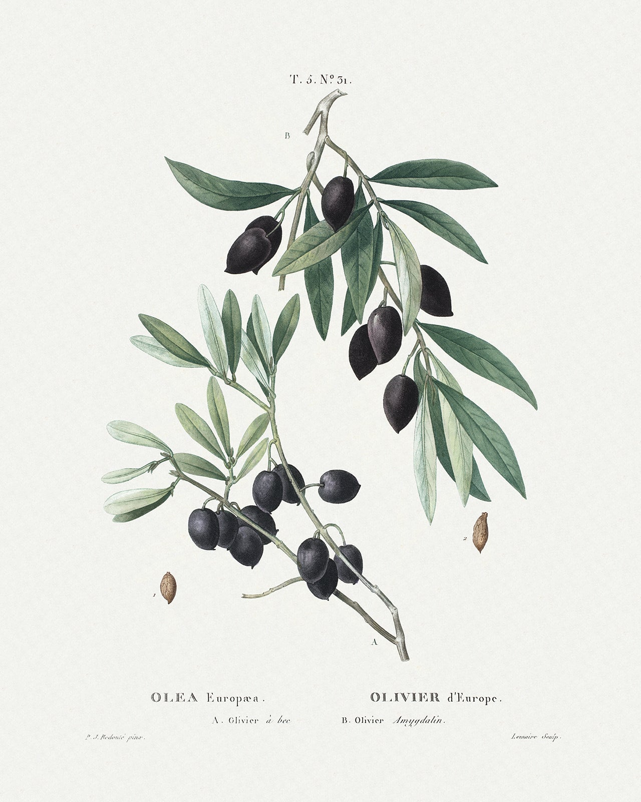 Olive branch botanical reproduction art print #31, by Pierre Joseph Redouté: c. 1801-1819. Print # 31: A. Olivier à bee. B. Olivier Amygdalin.