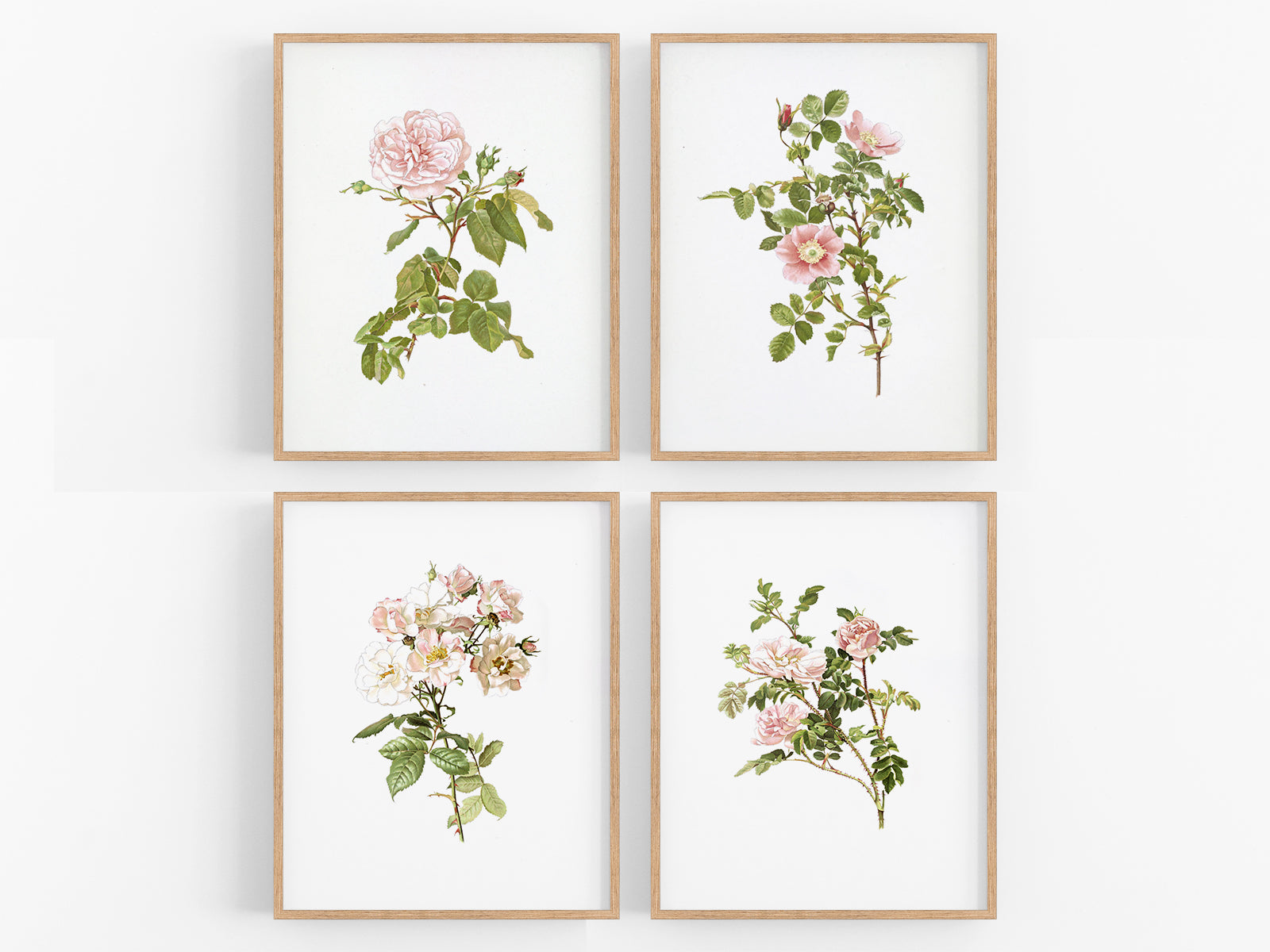 Pink Rose Flower Botanical Art Prints - Set of Four