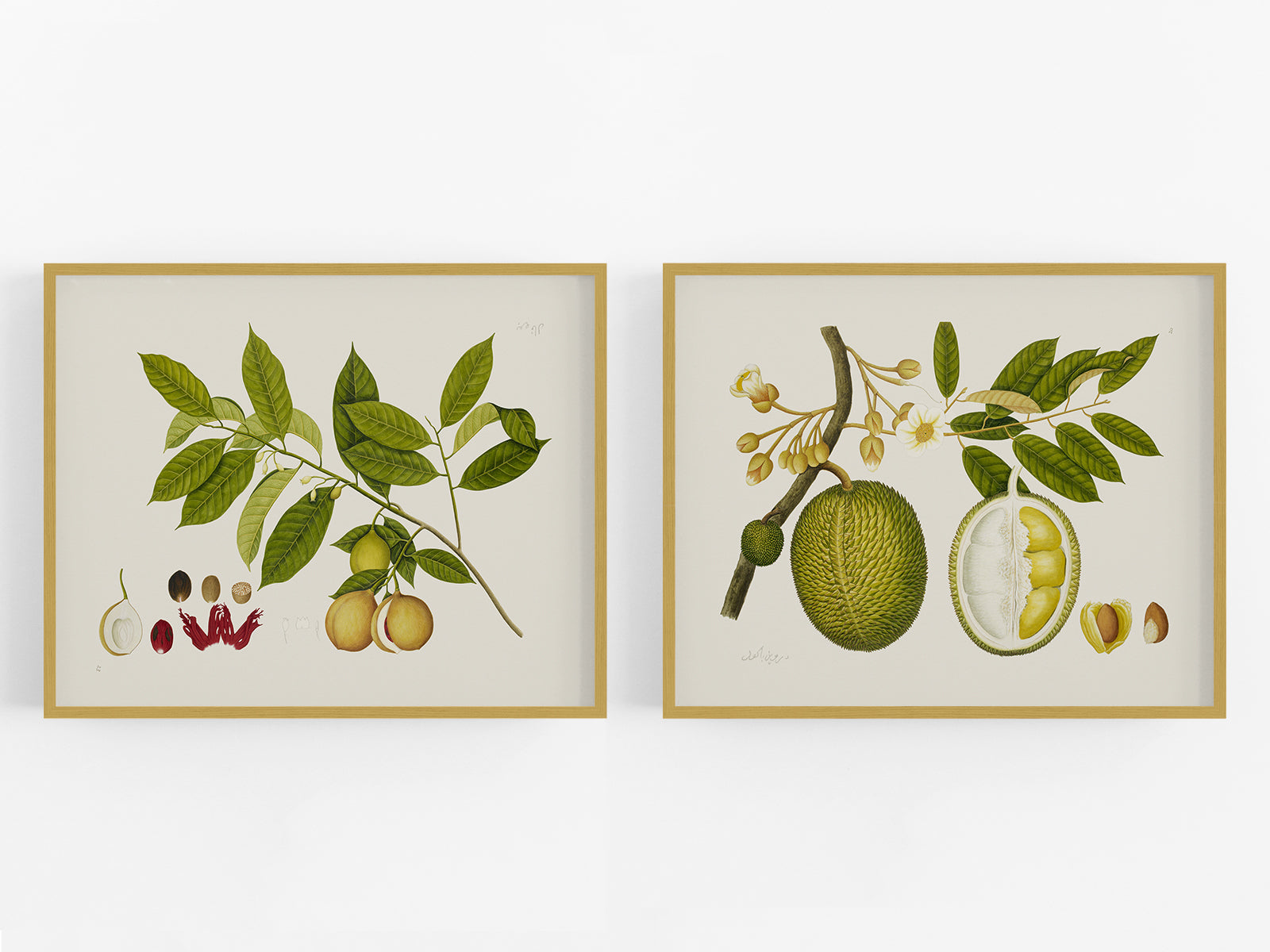 Set of Two (2) tree branch vintage reproduction art prints: Nutmeg & Durian (Durio Zibethinus), c. 1824. An East India Company art items from 40 Drawings of Plants at Bencoolen, Sumatra, for Sir Stamford Raffles.