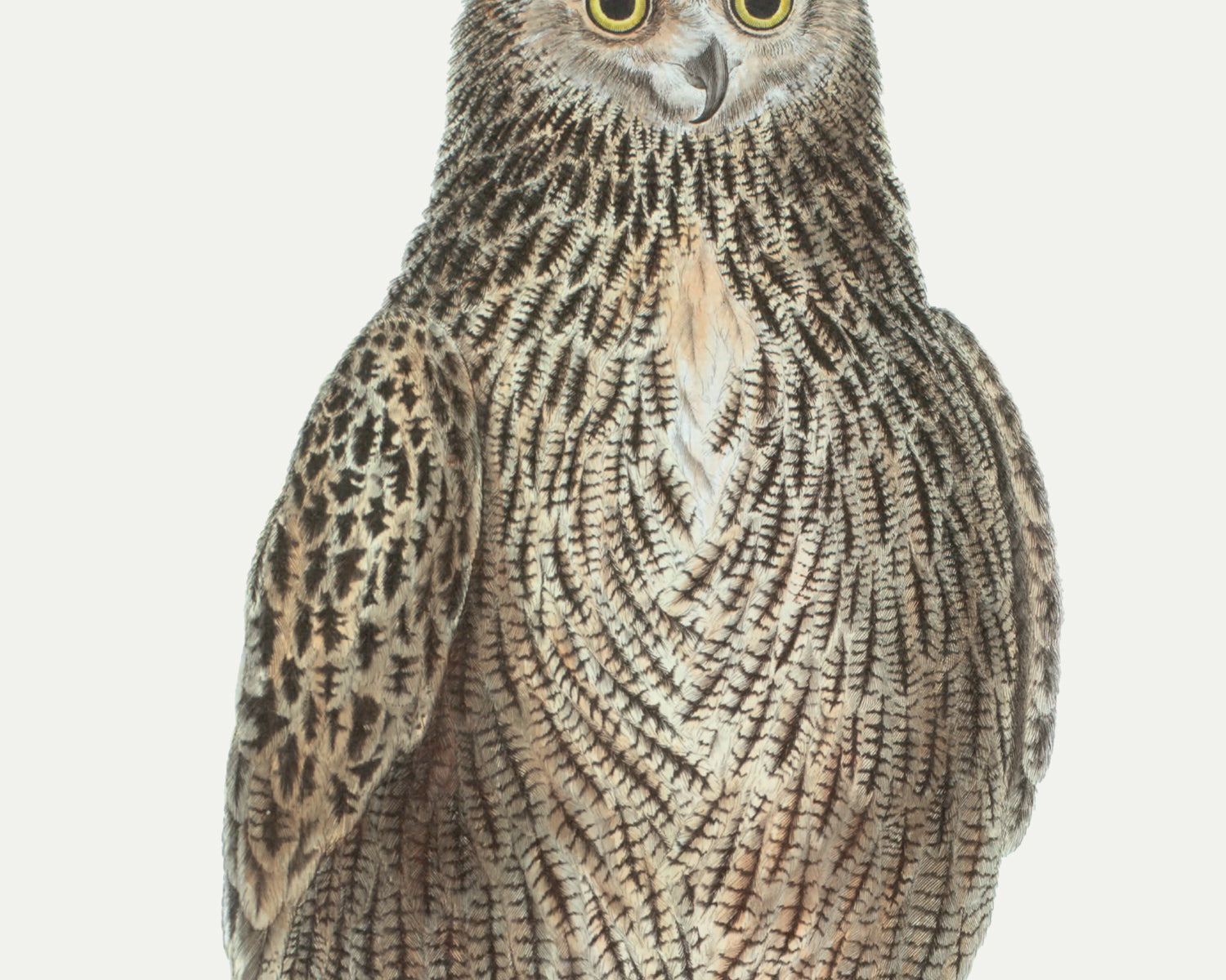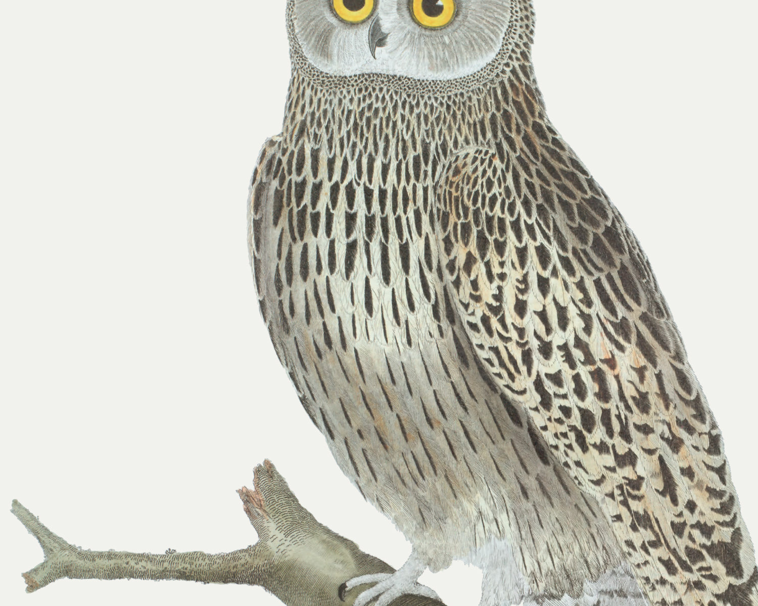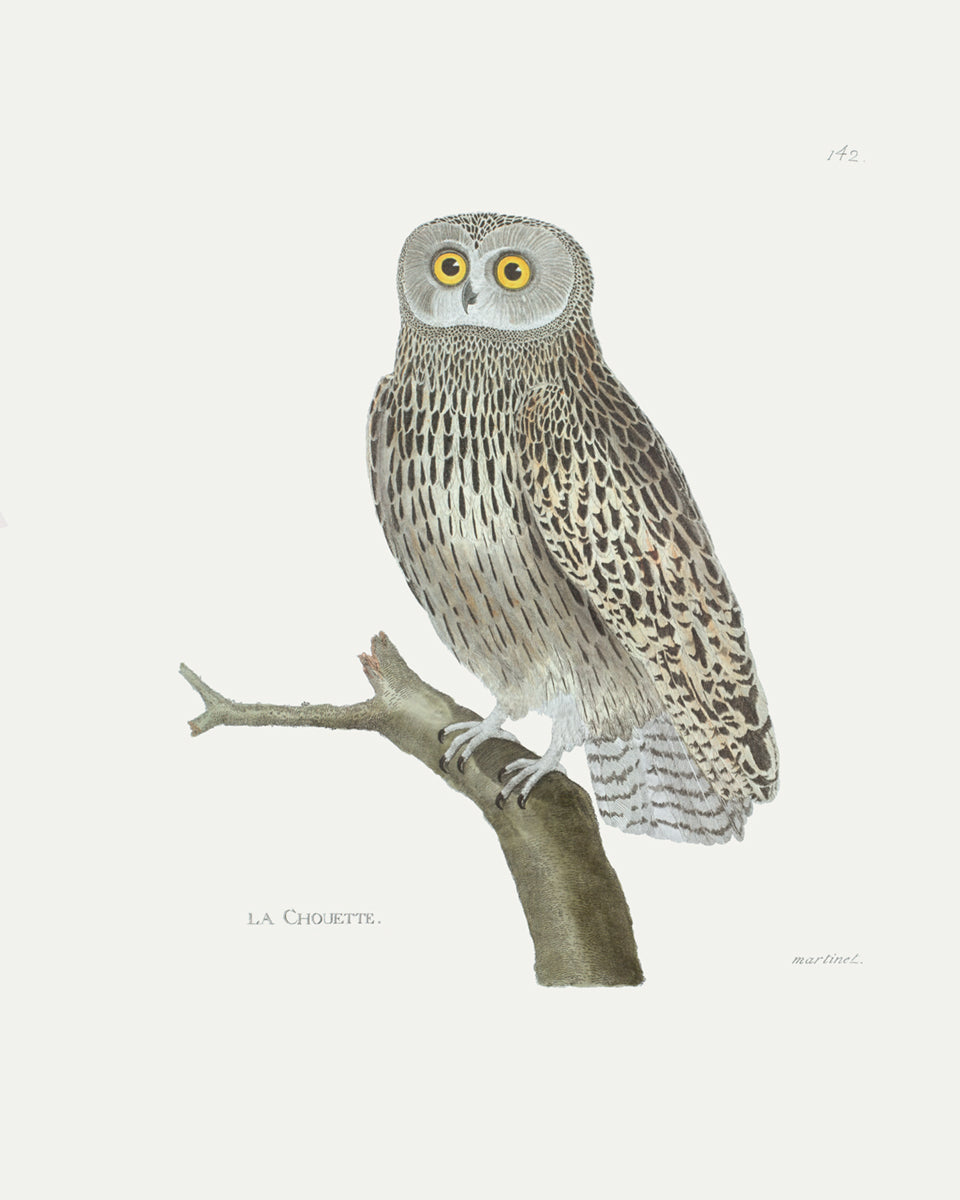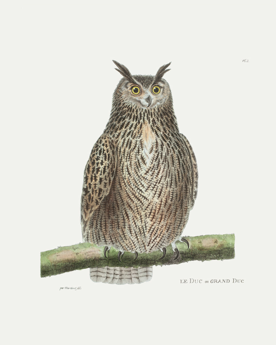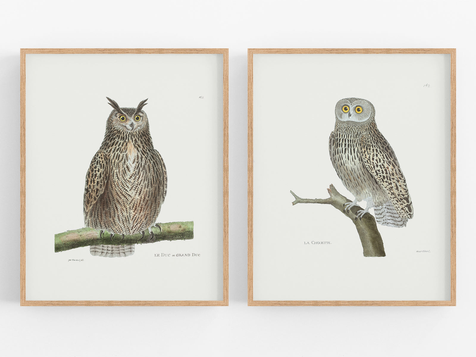 Set of two (2) French owl vintage reproduction art prints: titled The Owl and The Grand Duke, c. 1773.