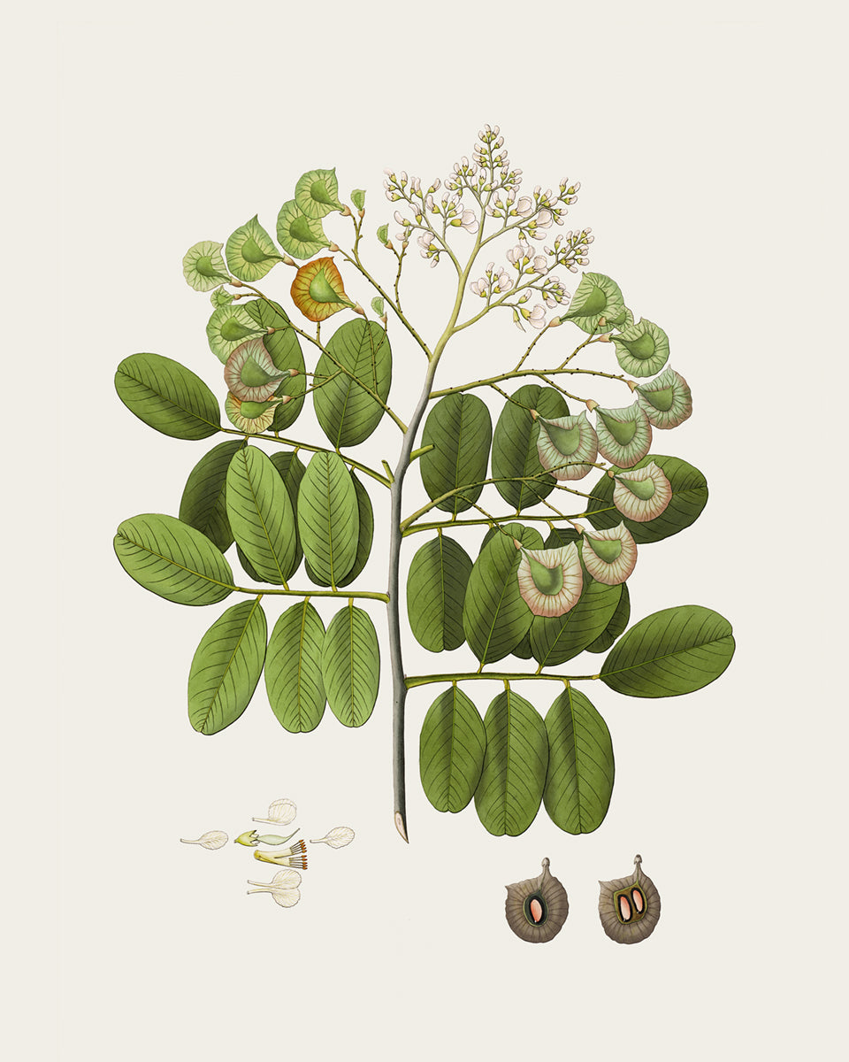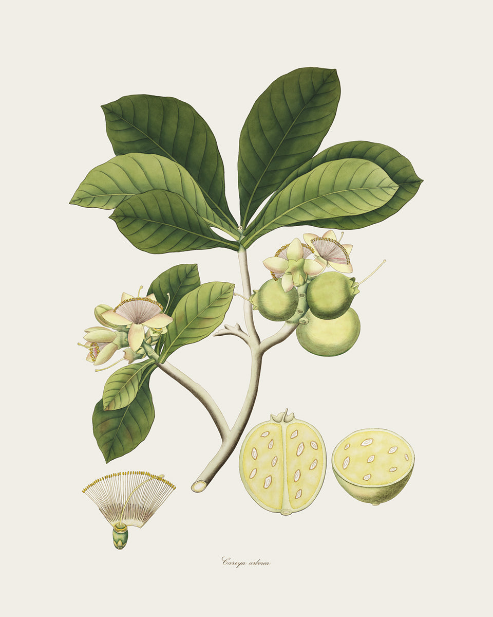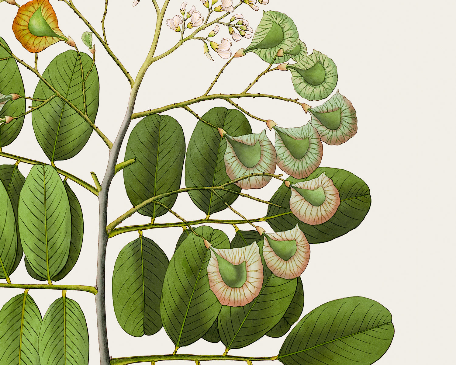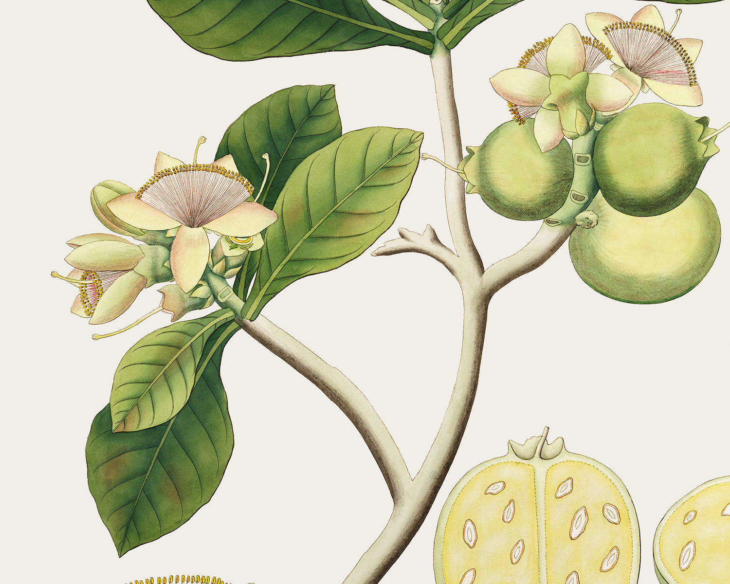 Set of two (2) East India Company botanical flowering tree branch art prints: Wild Guava (Ceylon Oak) and Indian Kino, c. 1795.