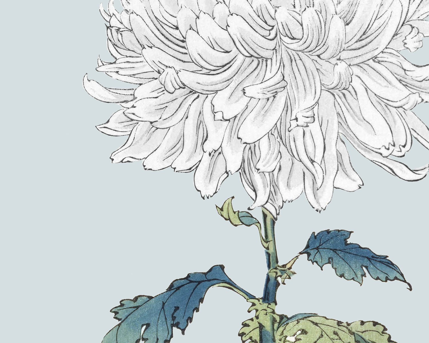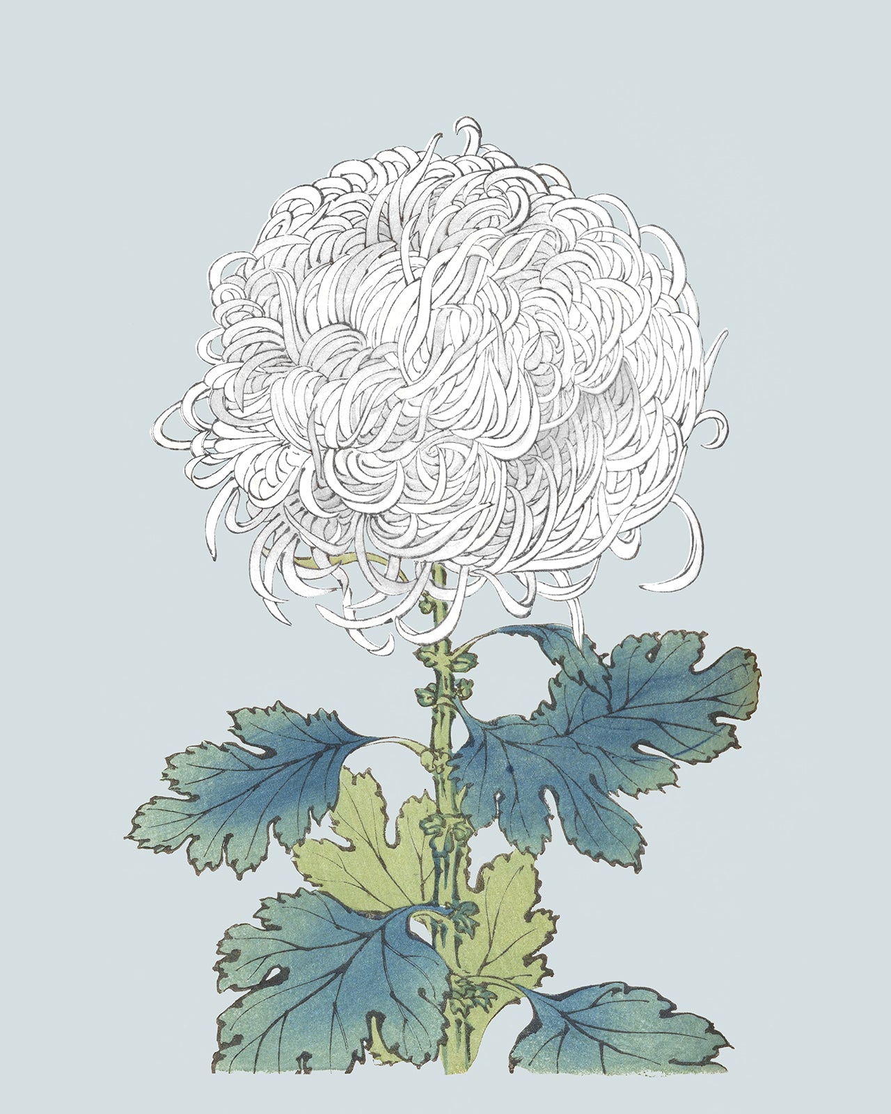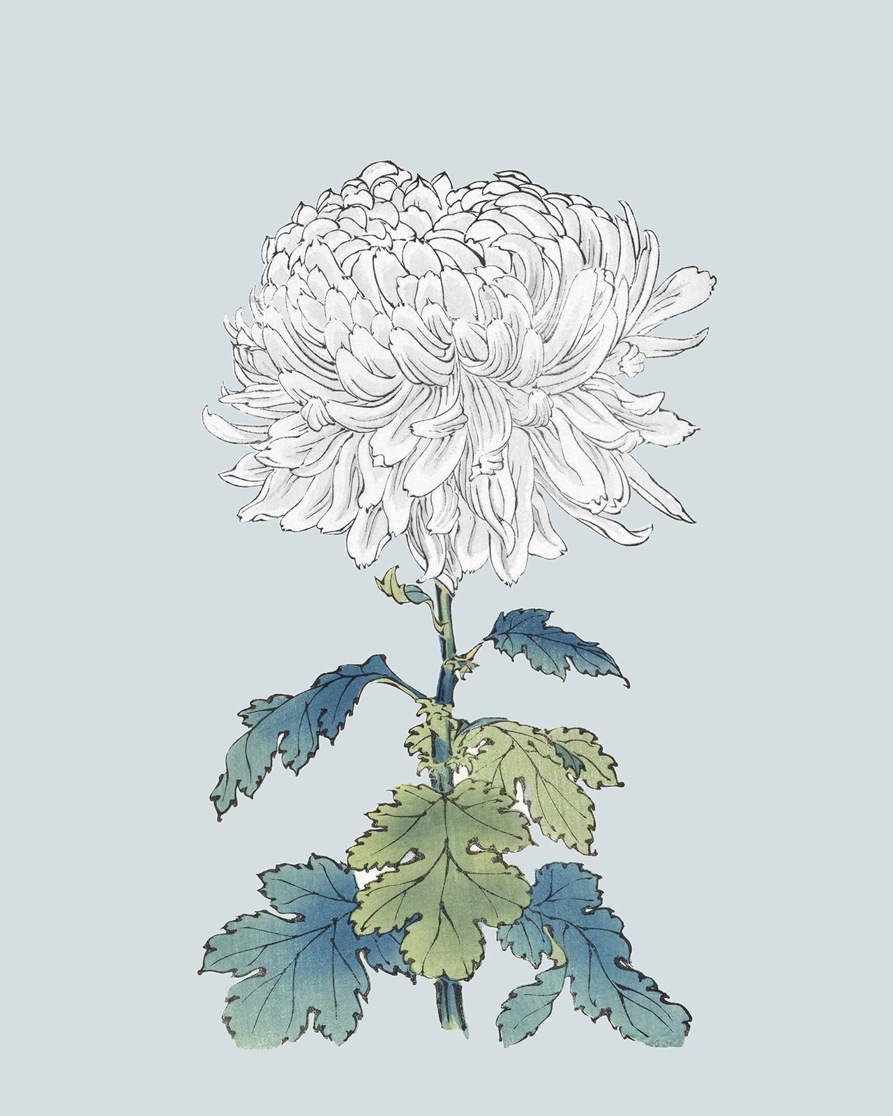 Set of two (2) Japanese white chrysanthemum flowers on blue reproduction art prints, c. 1893.