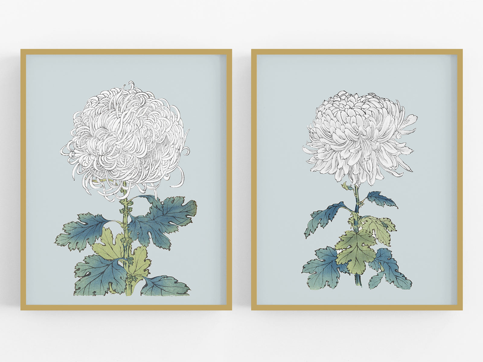 Japanese White Chrysanthemum Flowers on Blue Art Prints - Set of Two