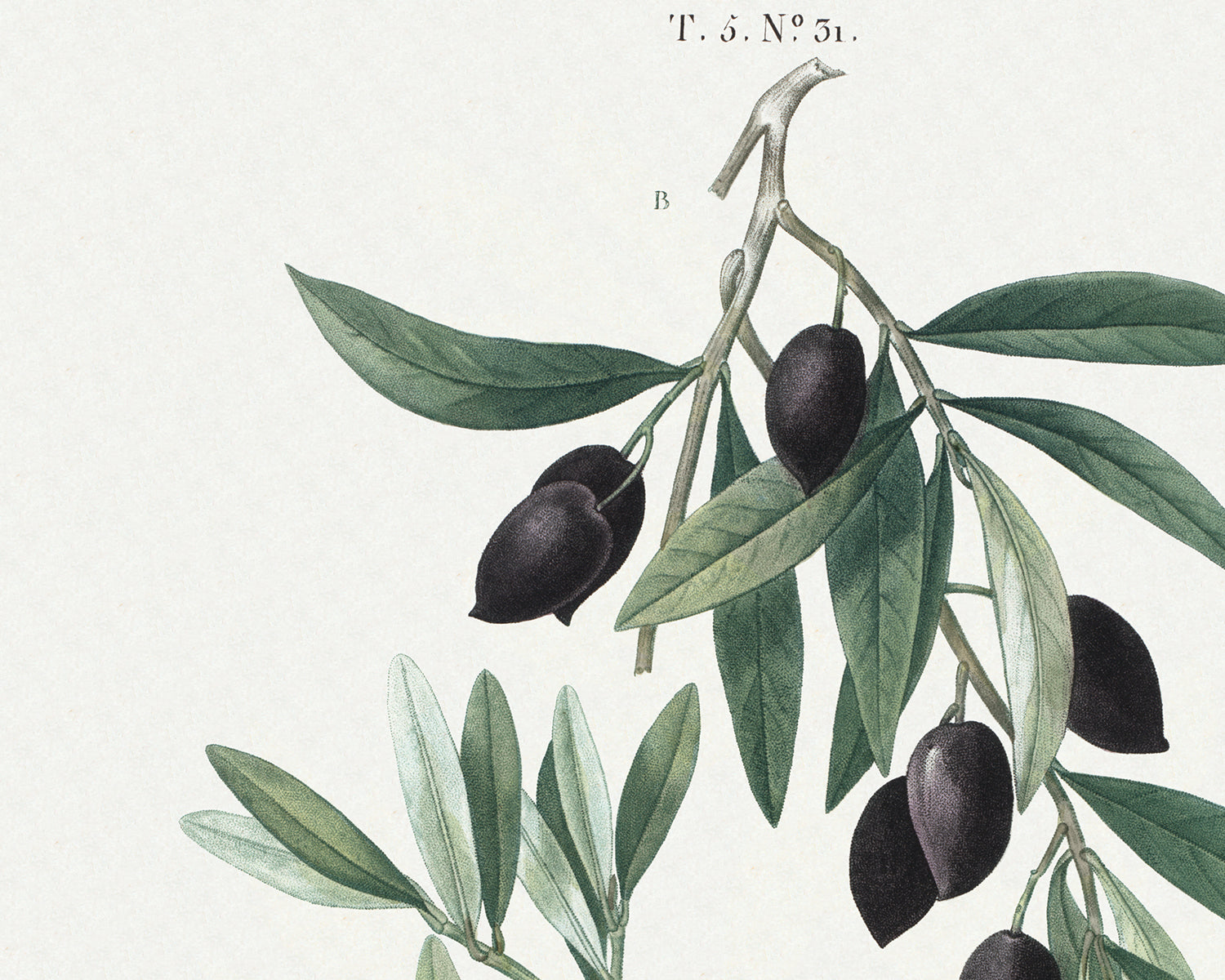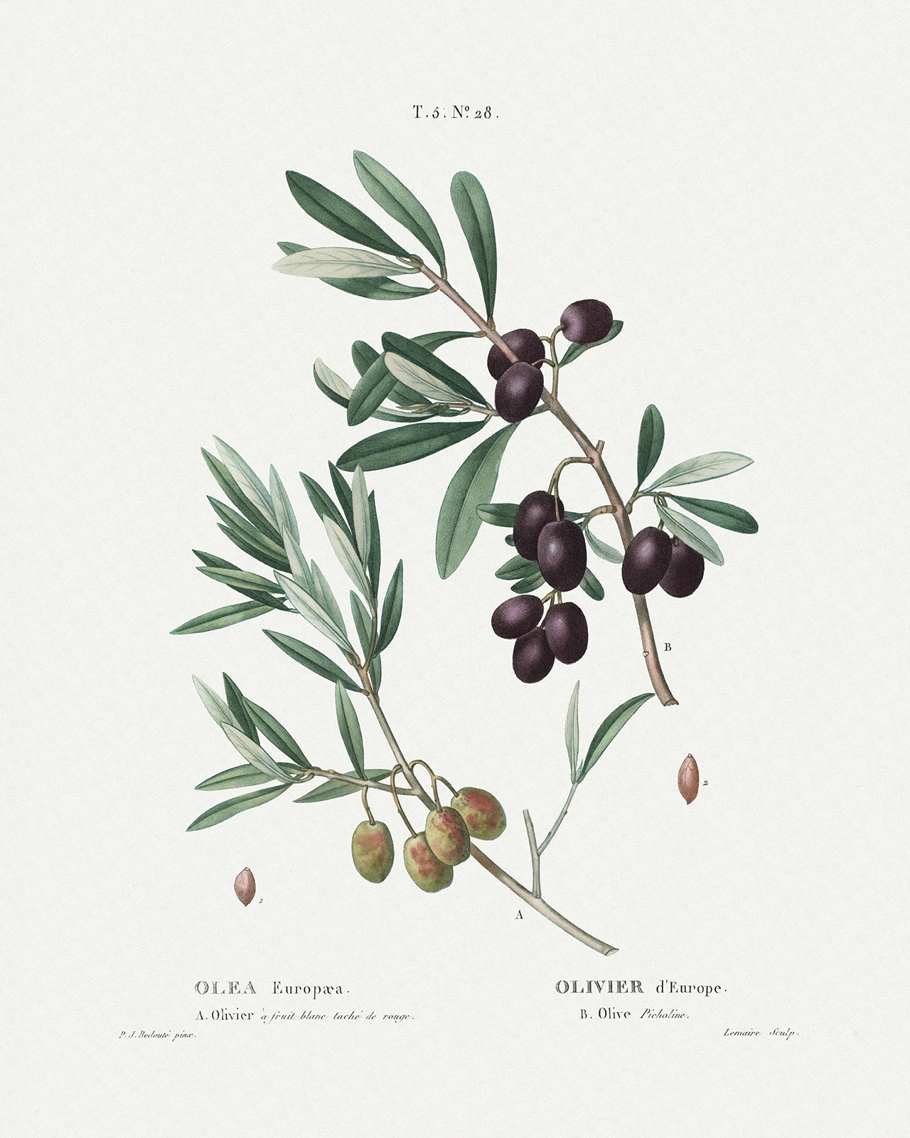 Print # 28: A. Olivier à fruit blanc tache e rouge. B. Olive Picholine. (Green and black olives)