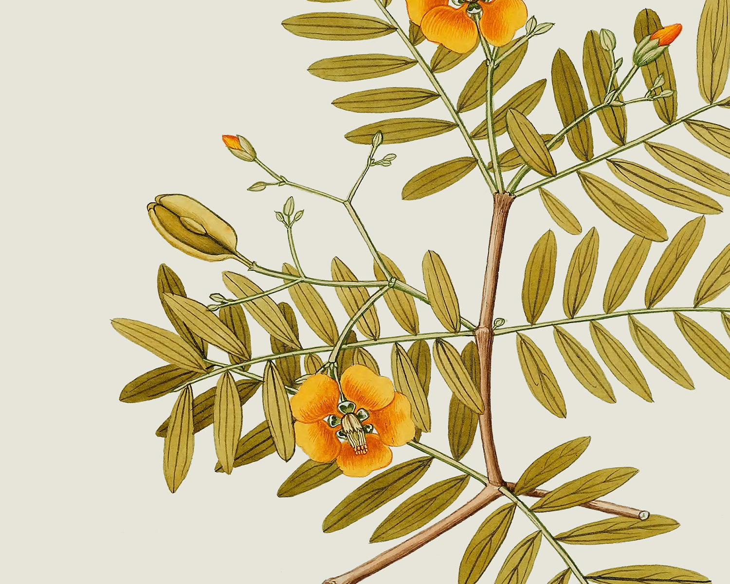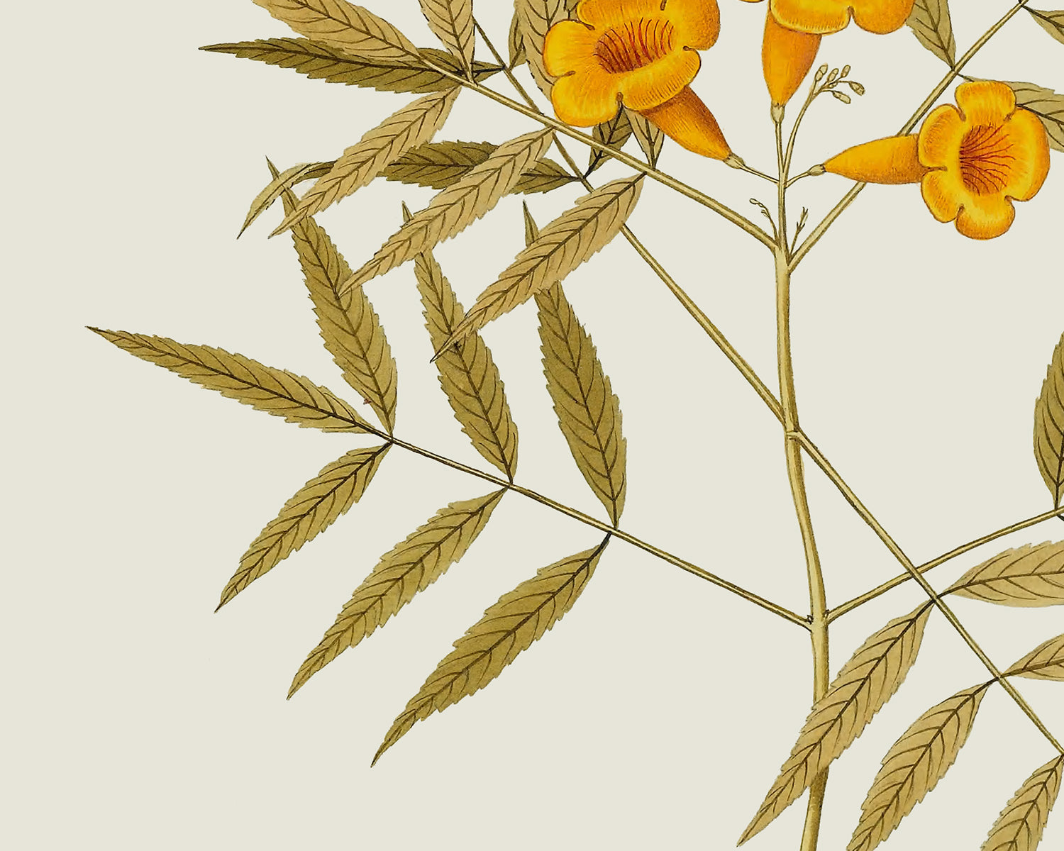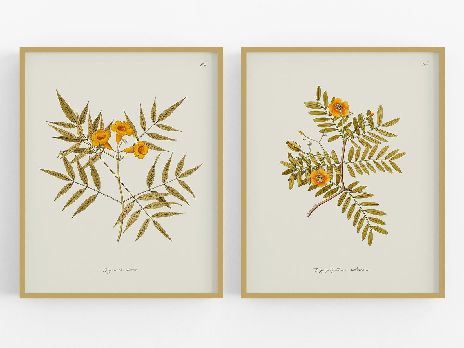 Set of Two (2) orange flower botanical reproduction art prints: zygophyllum and bignonia (trumpet flower), c. 1780.