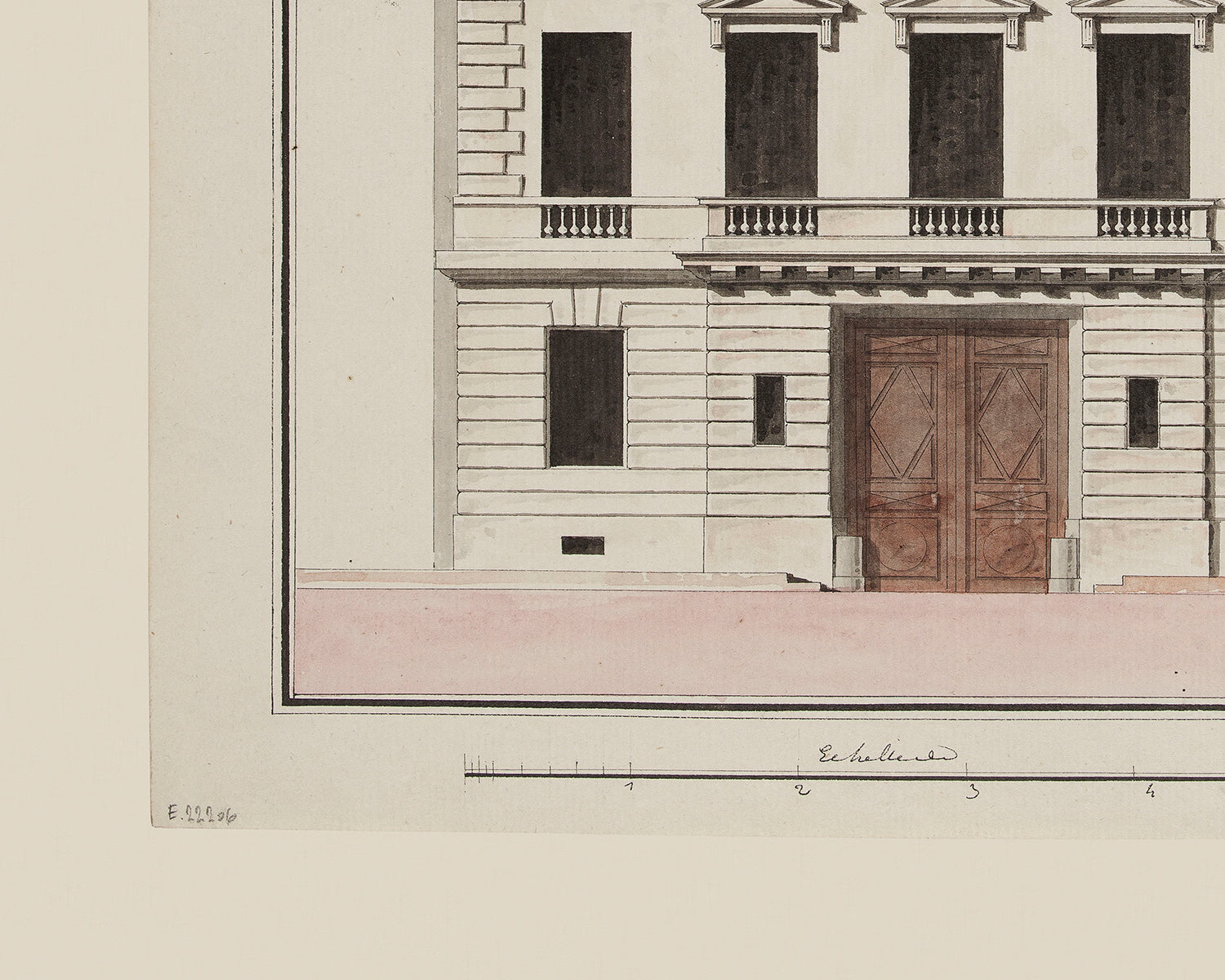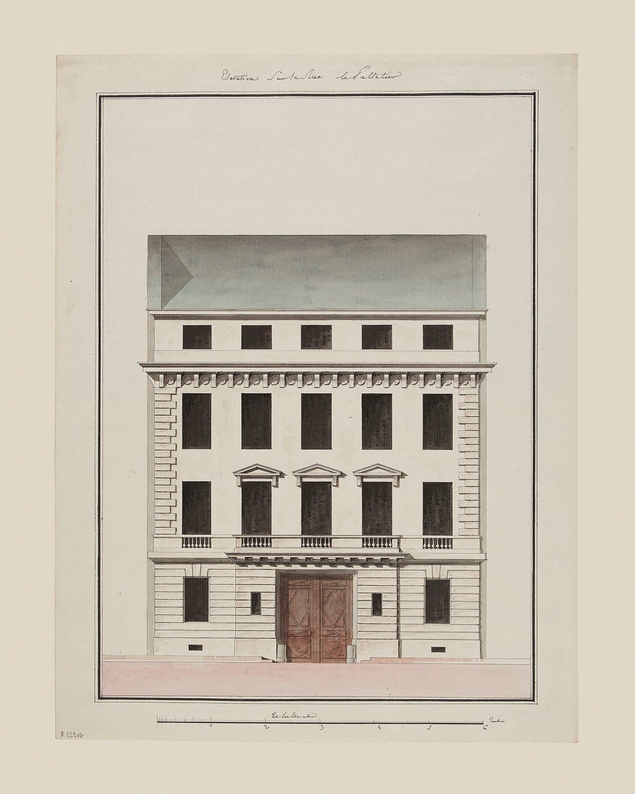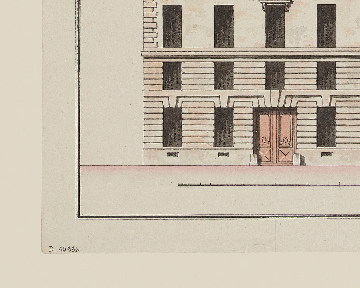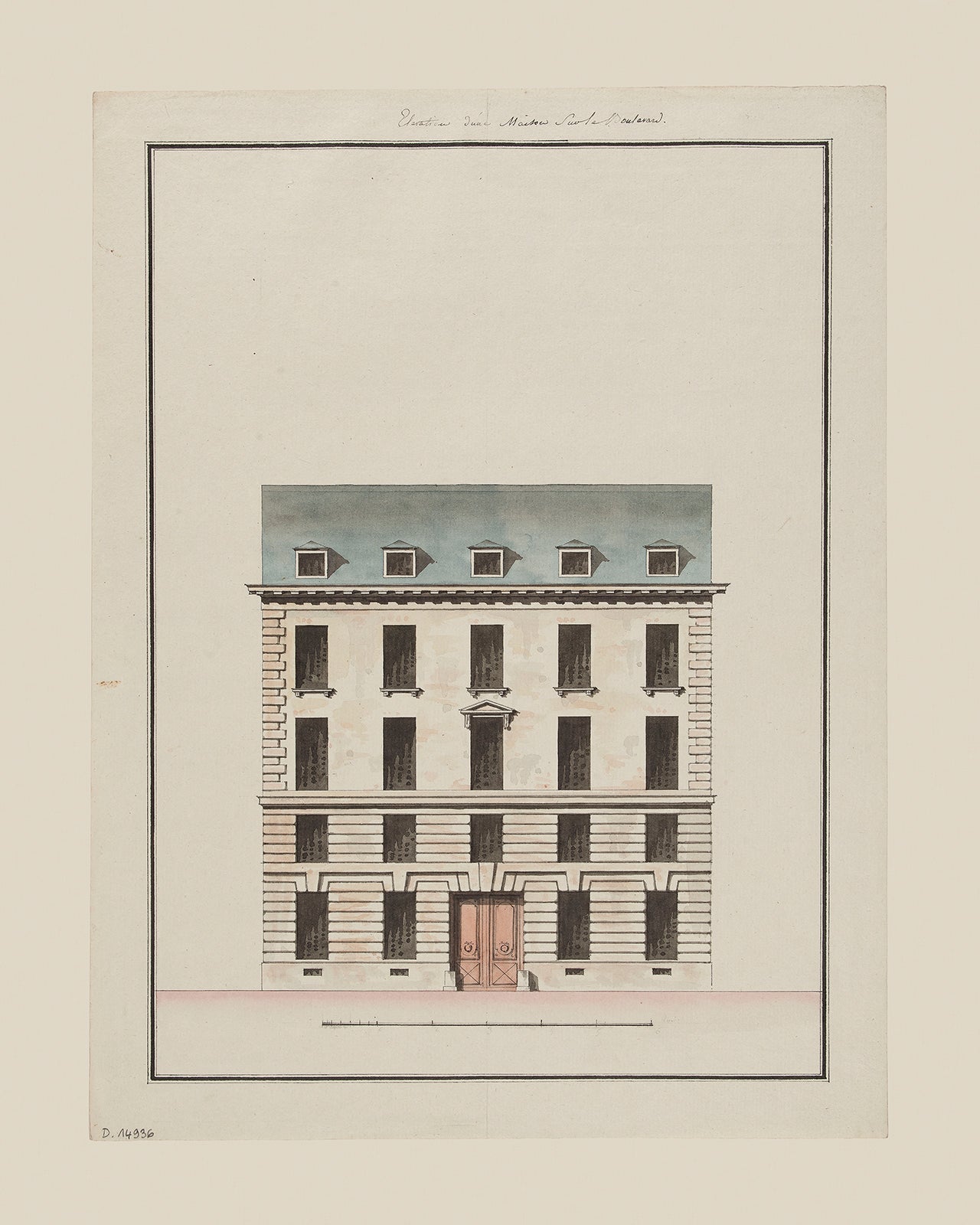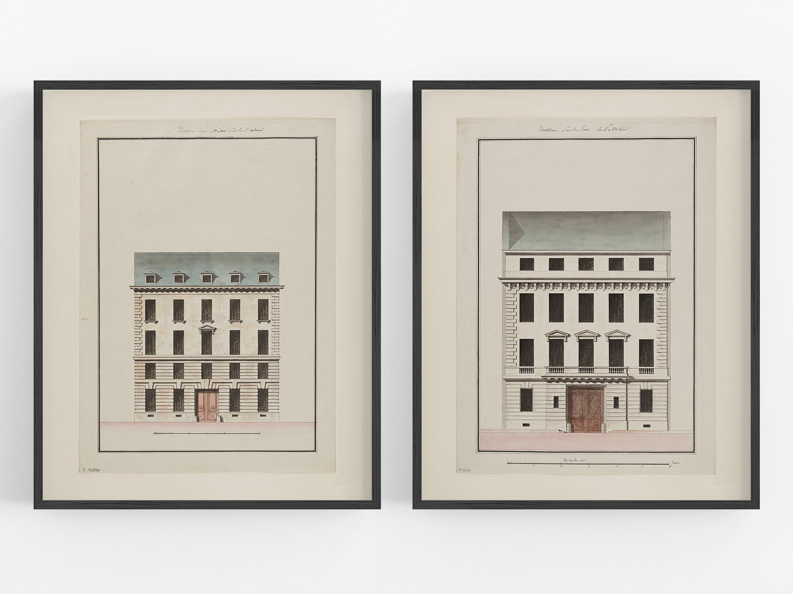 Set of two (2) vintage townhouse elevation drawings of houses on the Boulevard of Rue Le Peletier, Paris France.