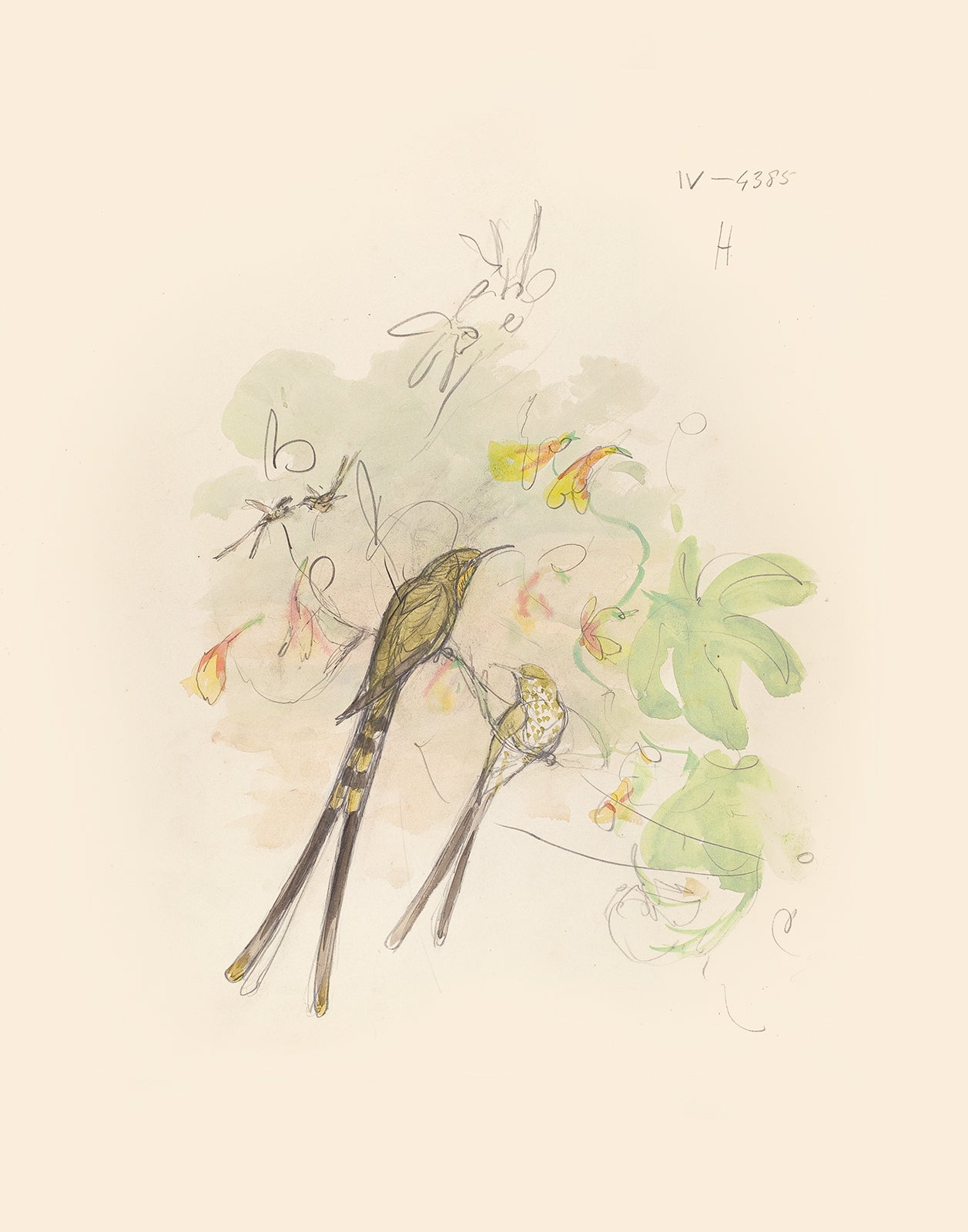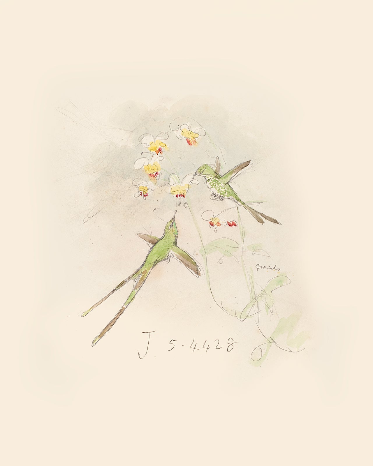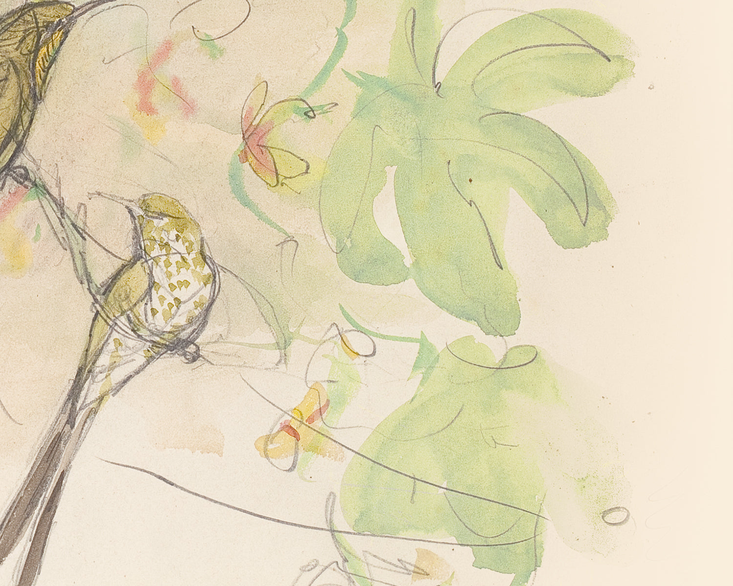 Set of two (2) vintage watercolor hummingbird sketch art print with artist notes: Green-tailed Trainbearer, c. 1860.