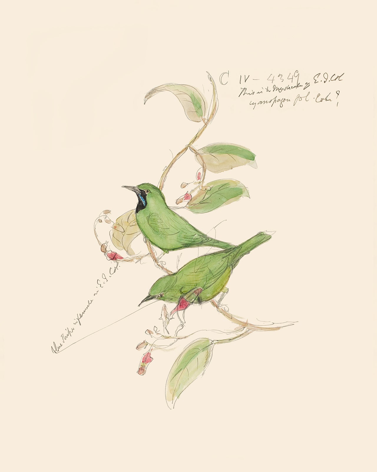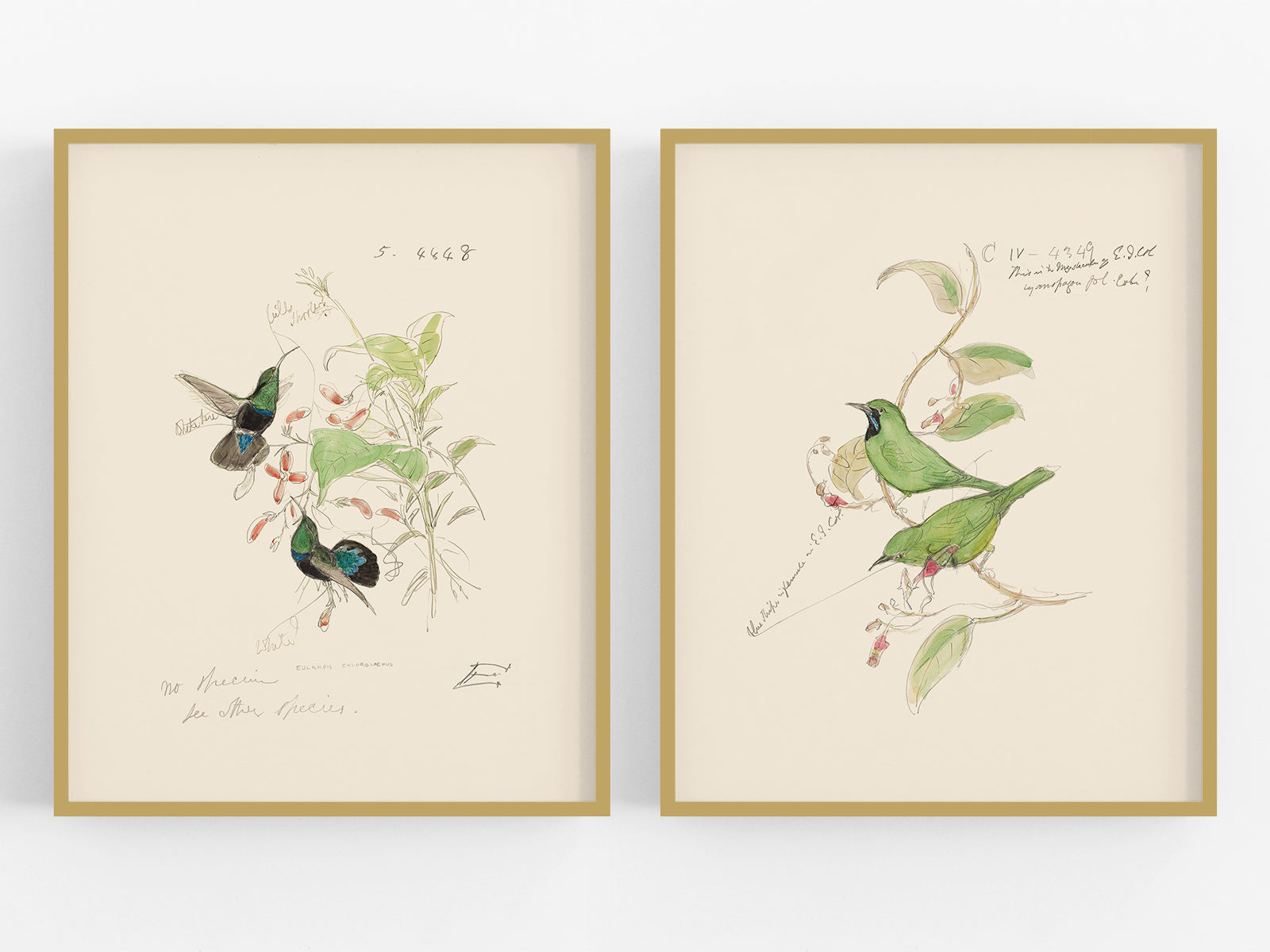 Set of two (2) vintage watercolor hummingbird sketch art print with artist notes: Green-throated Carib and Lesser Green Leafbird, c. 1860.