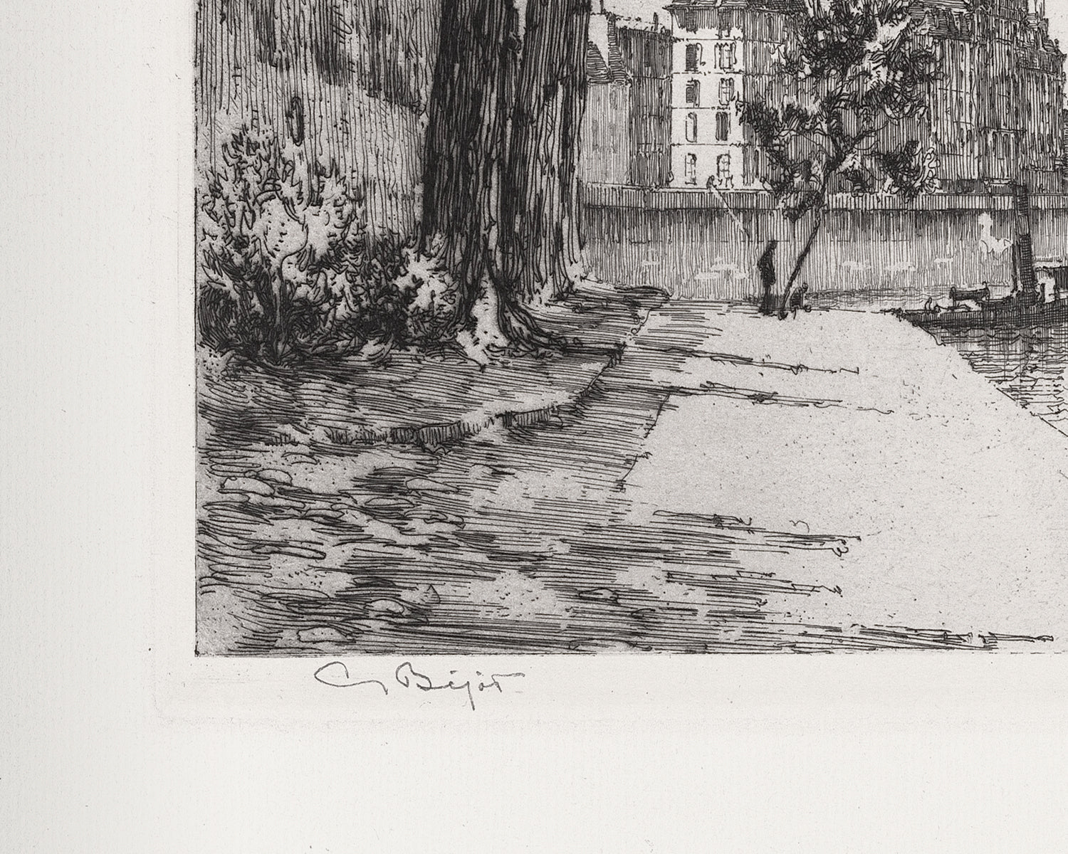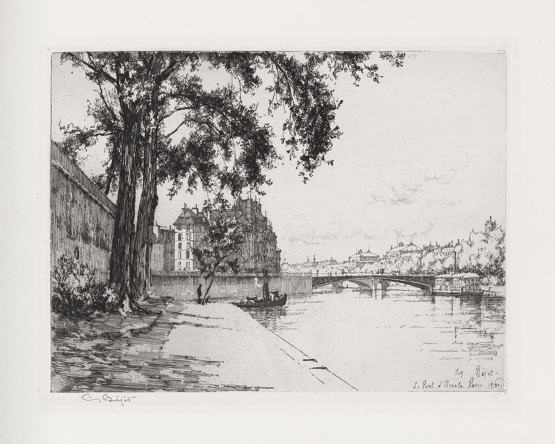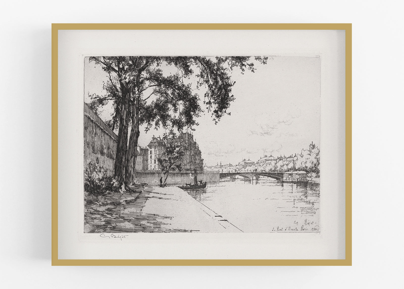 The Arcole Bridge Paris, etching reproduction art print, c. 1920.