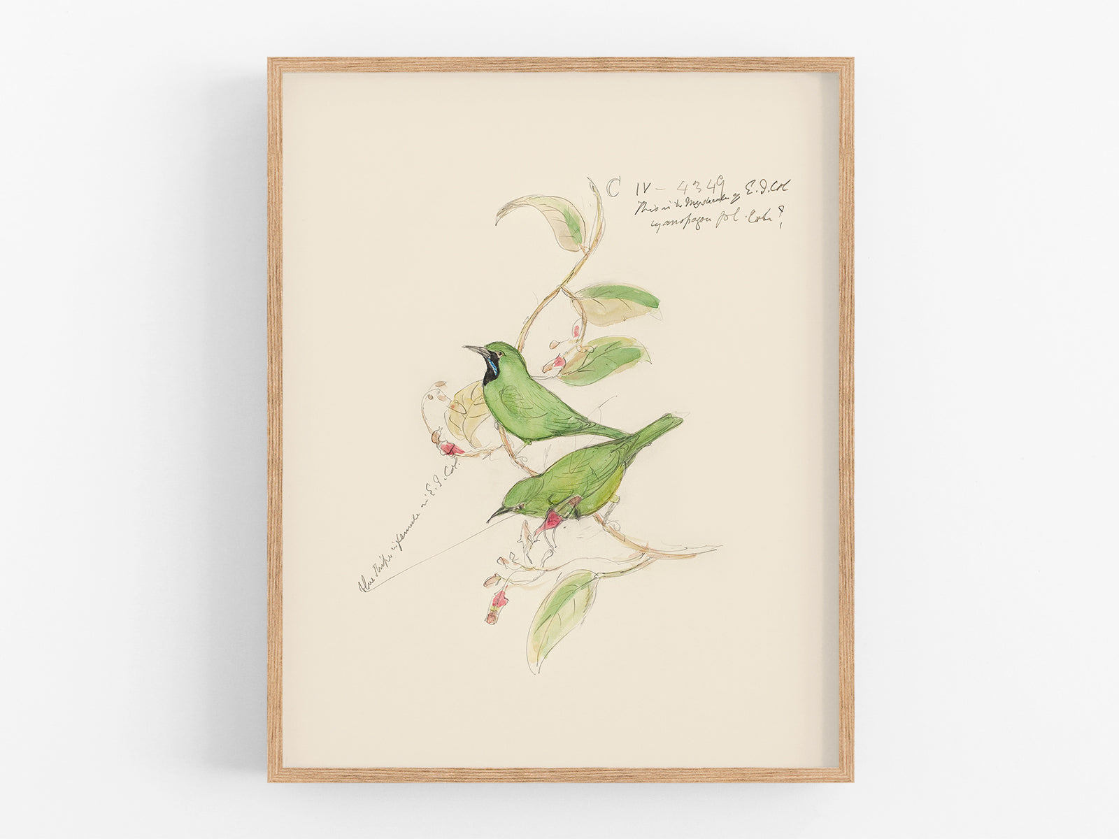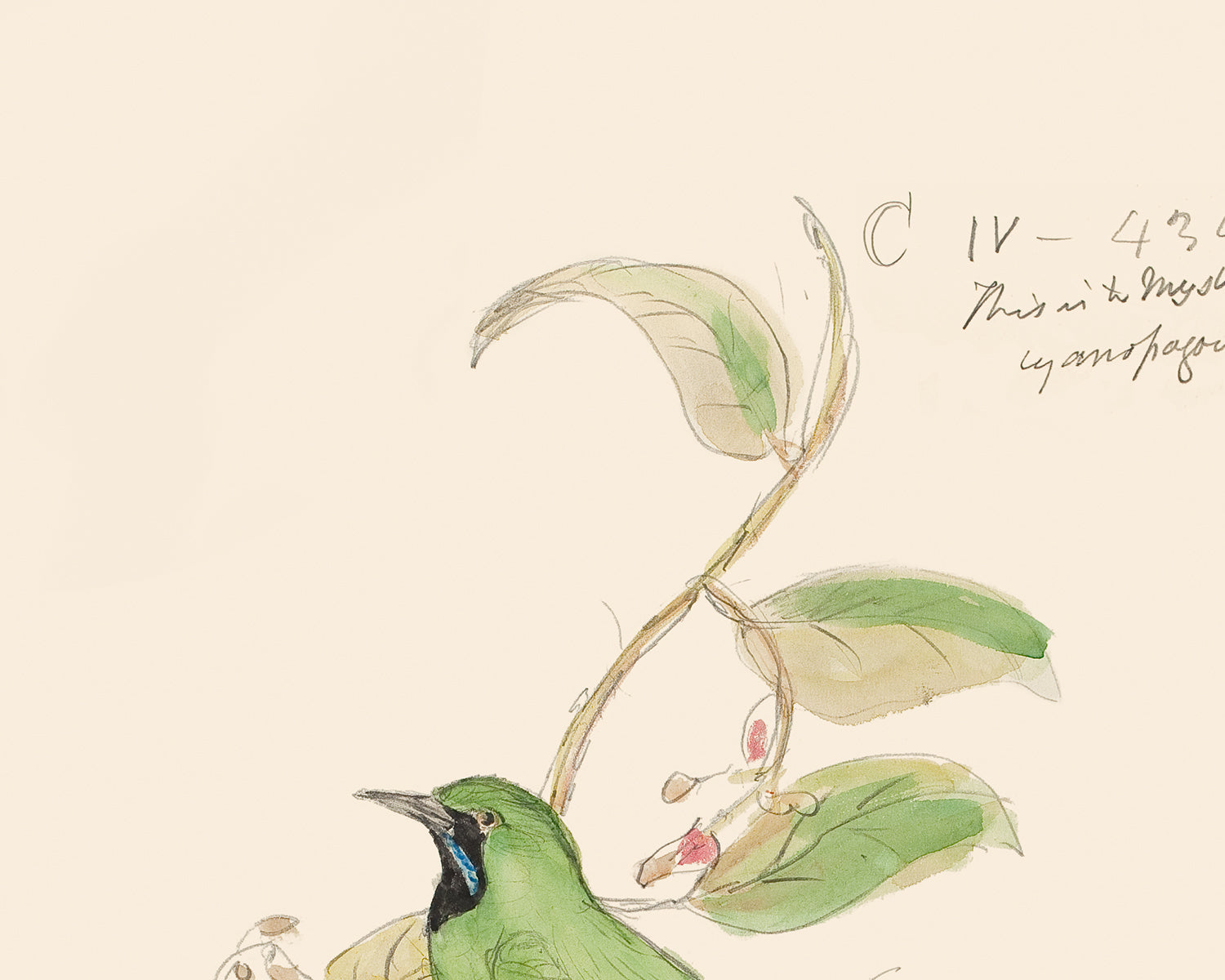 Reproduction art prints, sold unframed. Vintage watercolor hummingbird sketch art print with artist notes: Lesser Green Leafbird, c. 1860. |