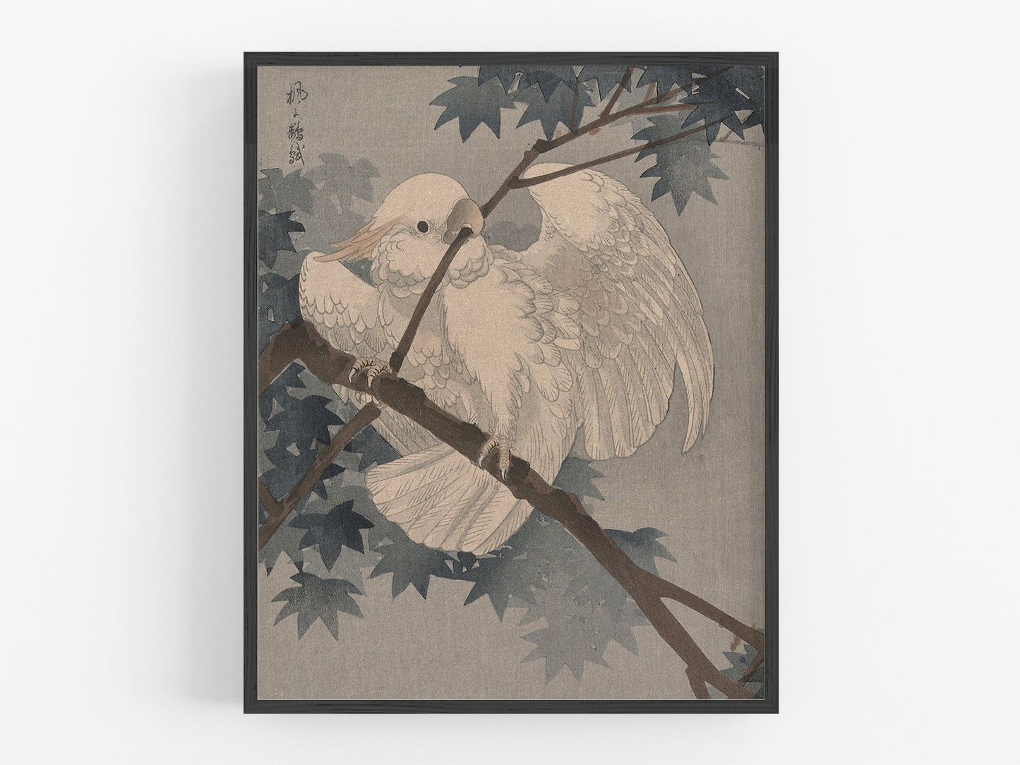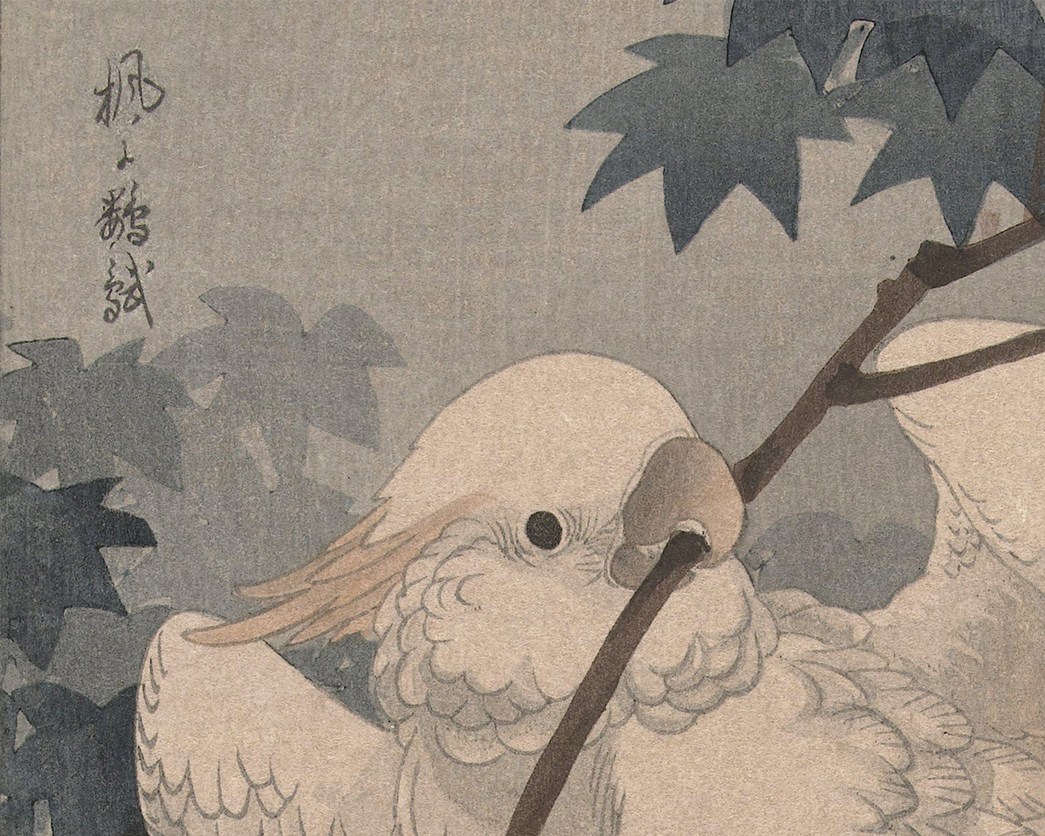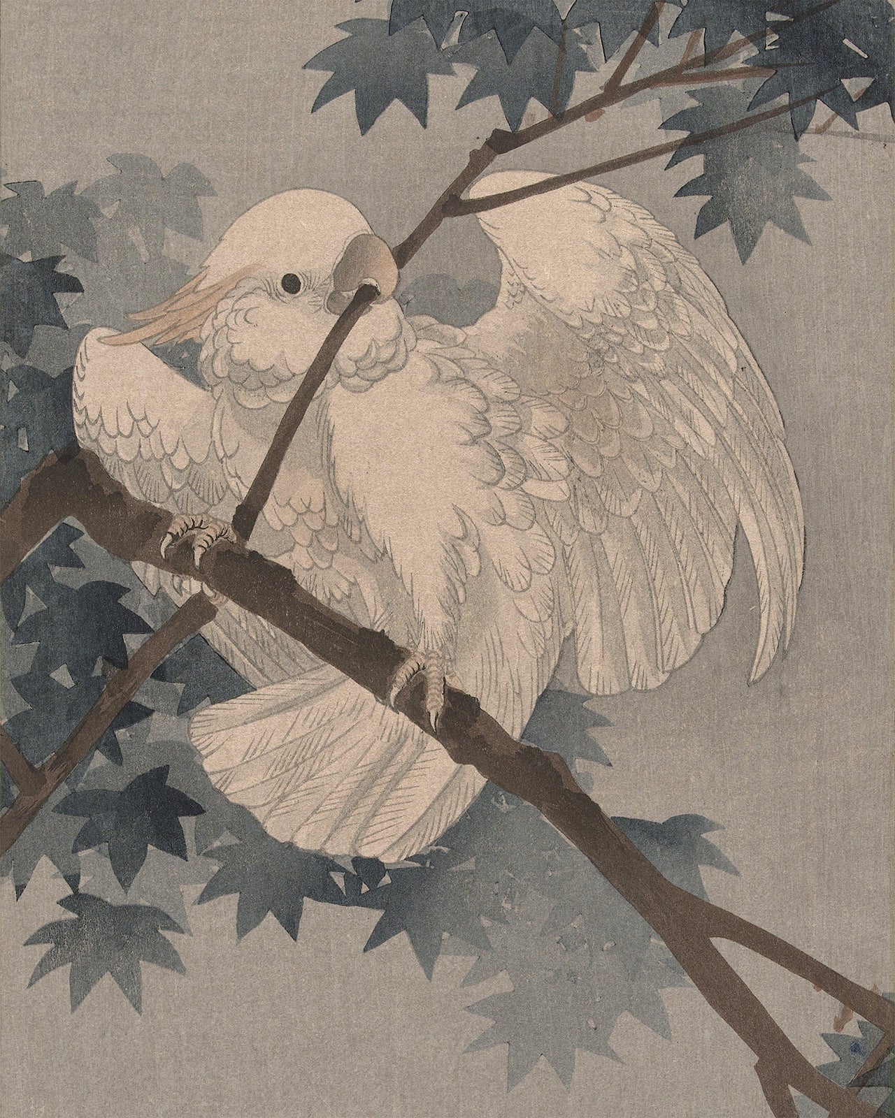 Vintage Japanese woodcut: Yellow crested cockatoo in tree, c. 1900-1940.